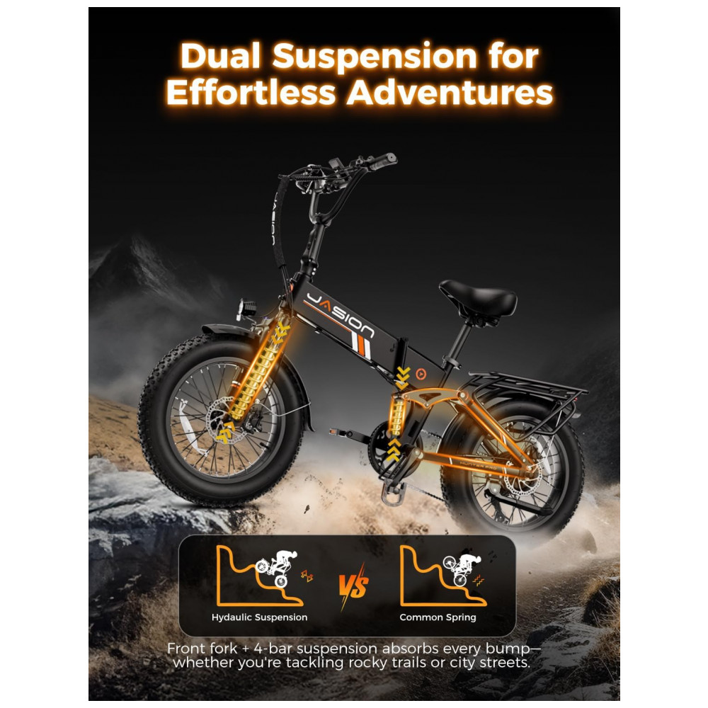 Bicicleta elétrica dobrável Jasion X-Hunter Pro preta com cesto pneus 20×4 motor 750W pico 1800W bateria 48V 15Ah 80 km 110V