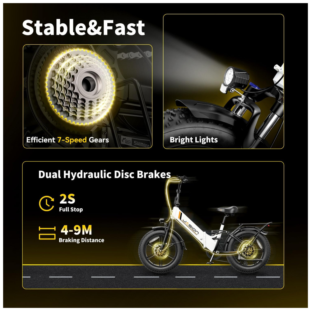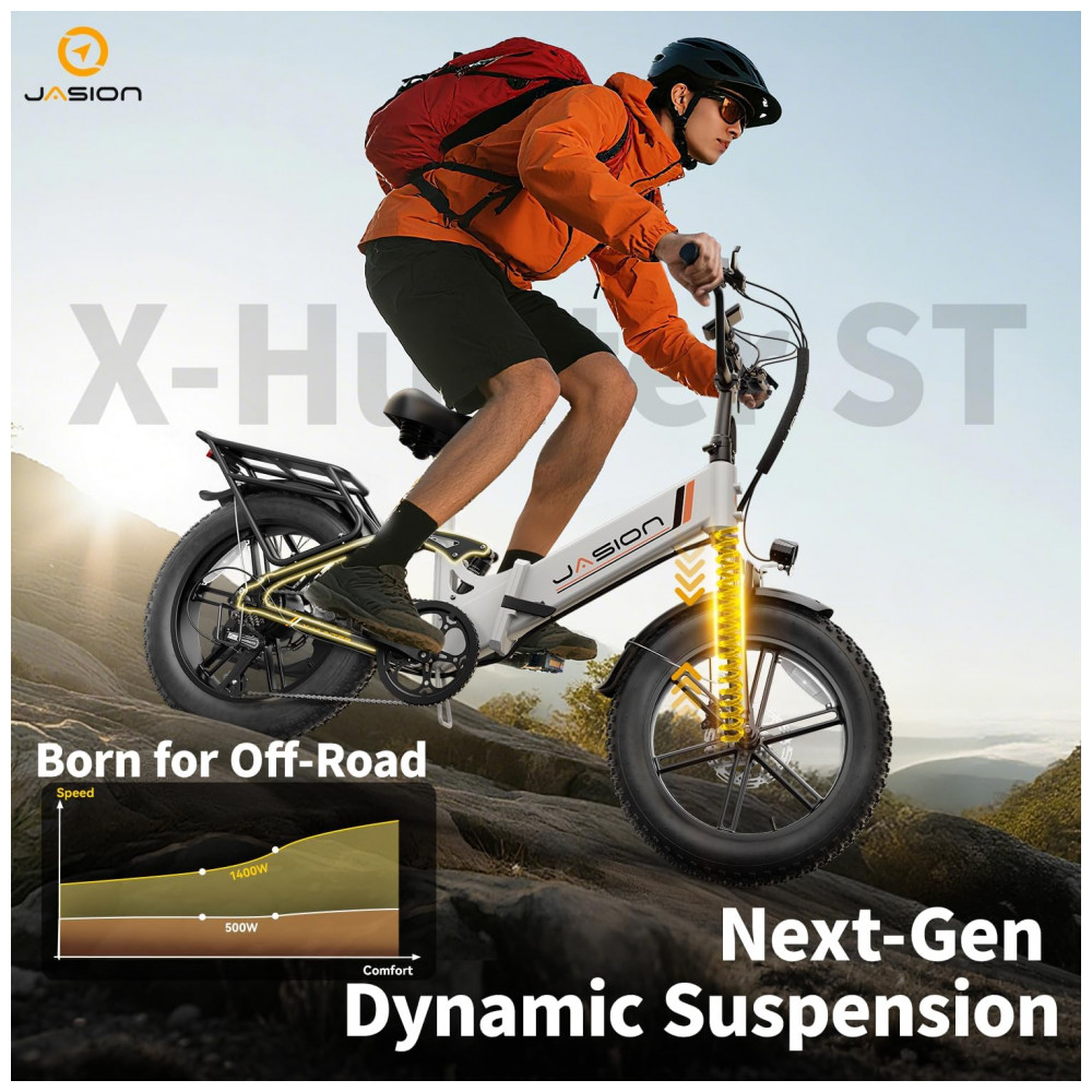 A bicicleta elétrica dobrável Jasion X-Hunter ST branca com cesto traseiro foi desenvolvida para adultos que buscam um modelo compacto com quadro rebaixado para uso urbano, trilhas leves e deslocamentos em diferentes tipos de terreno. O quadro em alumínio tipo step-through facilita subir e descer da bicicleta, enquanto os pneus largos 20 x 4 e a suspensão dupla garantem mais estabilidade e conforto em vias pavimentadas, estradas de terra, cascalho, neve e areia.