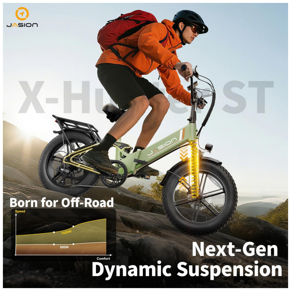 A bicicleta elétrica dobrável Jasion X-Hunter ST verde com cesto foi desenvolvida para adultos que buscam um modelo compacto com quadro rebaixado para uso urbano, trilhas leves e deslocamentos em diferentes tipos de terreno. O quadro em alumínio com geometria step-through facilita subir e descer da bicicleta, enquanto os pneus largos 20 x 4 e a suspensão dupla proporcionam estabilidade e conforto em vias pavimentadas, estradas de terra, cascalho, neve e areia.