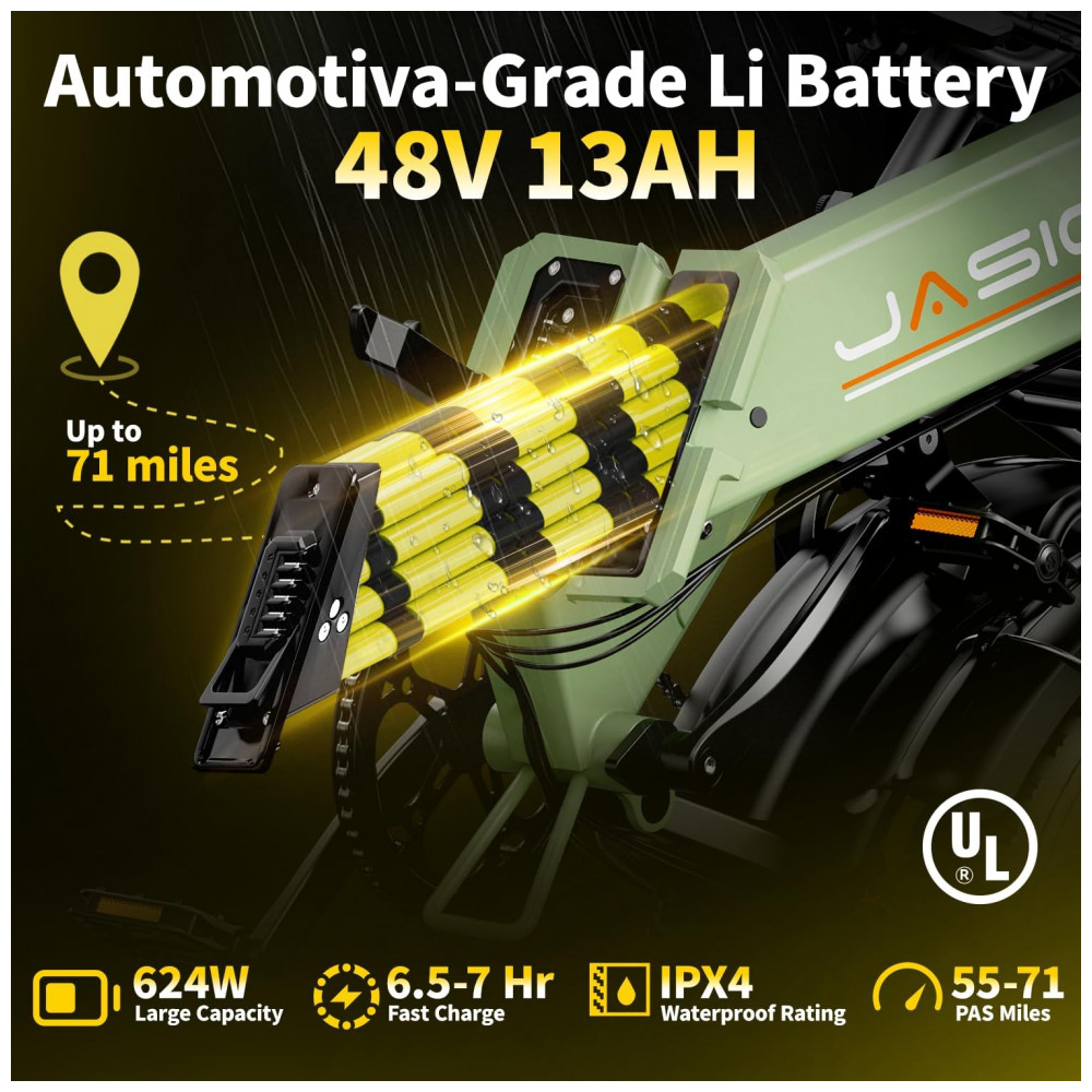 Bicicleta elétrica dobrável Jasion X-Hunter ST verde com cesto pneus 20×4 motor 750W pico 1400W bateria 48V 13Ah 70 km 110V