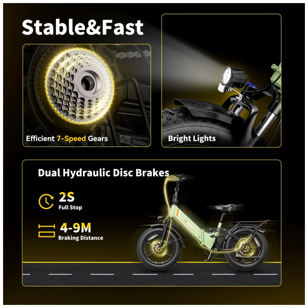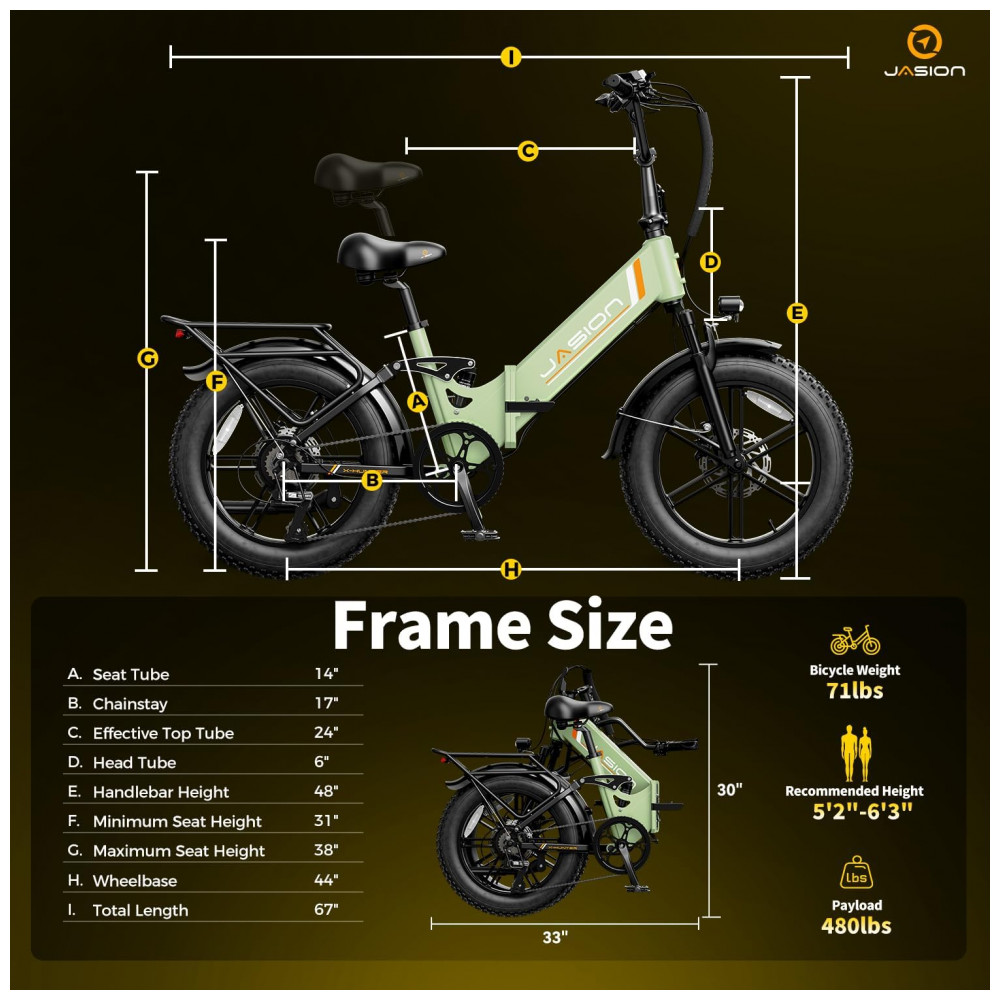 A bicicleta elétrica dobrável Jasion X-Hunter ST verde com cesto traseiro é indicada para adultos que buscam um modelo compacto com quadro rebaixado para deslocamentos urbanos, trilhas leves e uso recreativo em diferentes tipos de terreno. O quadro em alumínio tipo step-through facilita subir e descer da bicicleta, enquanto os pneus largos 20 x 4 e a suspensão dupla contribuem para maior estabilidade e conforto em vias pavimentadas, estradas de terra, cascalho, neve e areia.