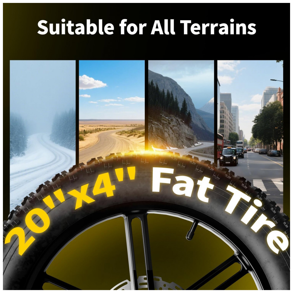 Os pneus fat 20 x 4 com cravos proporcionam boa tração em superfícies de baixa aderência, como areia, neve e trilhas de terra, além de maior conforto em asfalto. O quadro dobrável em alumínio facilita o transporte em porta‑malas e o armazenamento em espaços reduzidos, com peso em torno de 32 kg e capacidade de carga total de até cerca de 181 kg, incluindo condutor e carga no cesto.