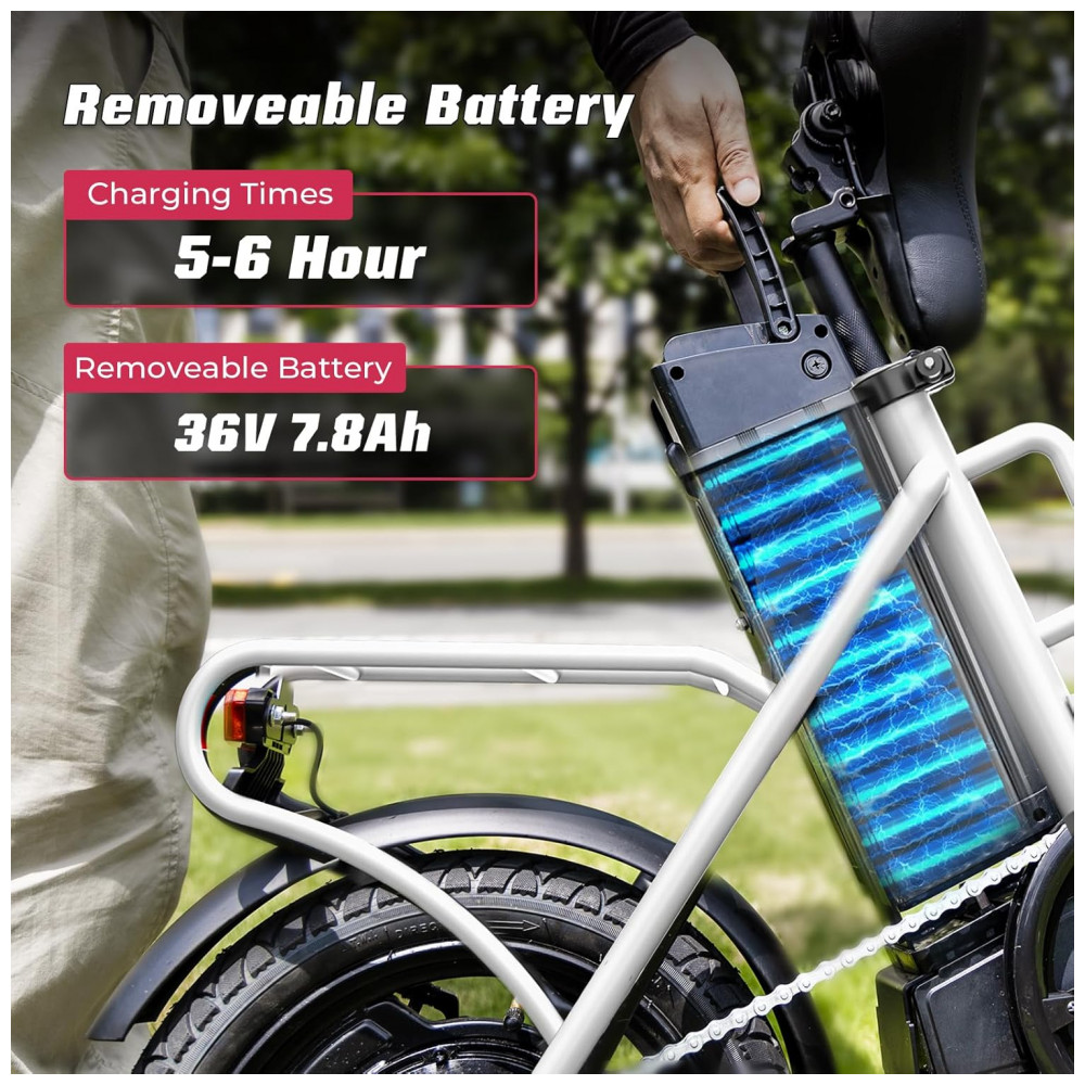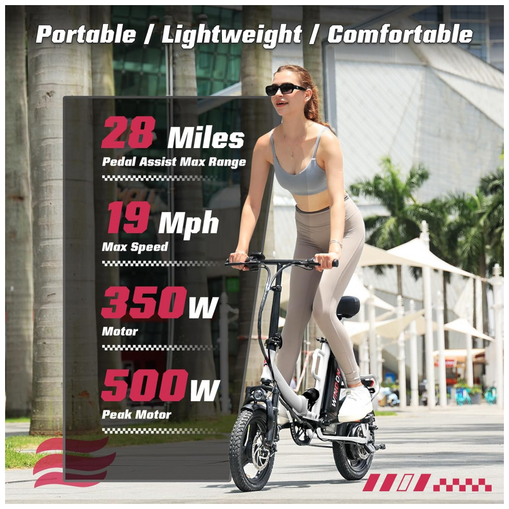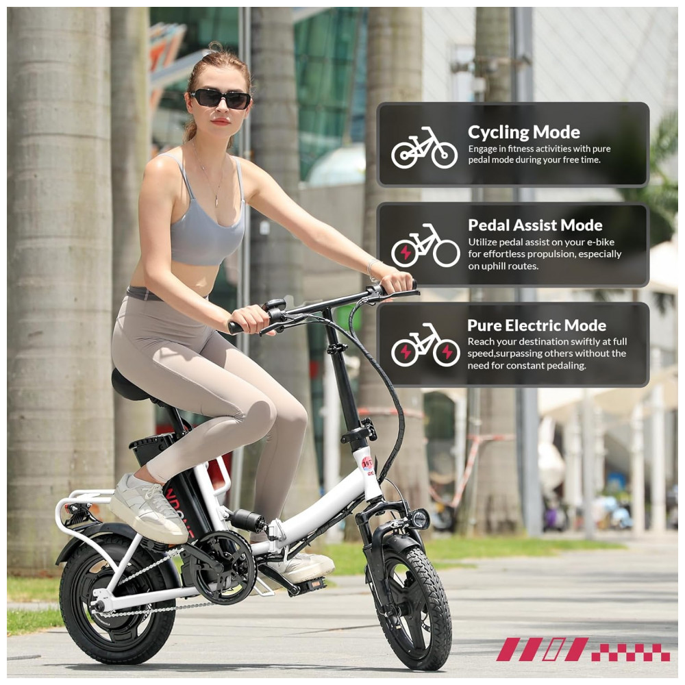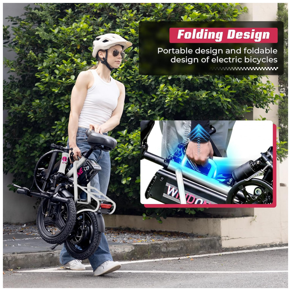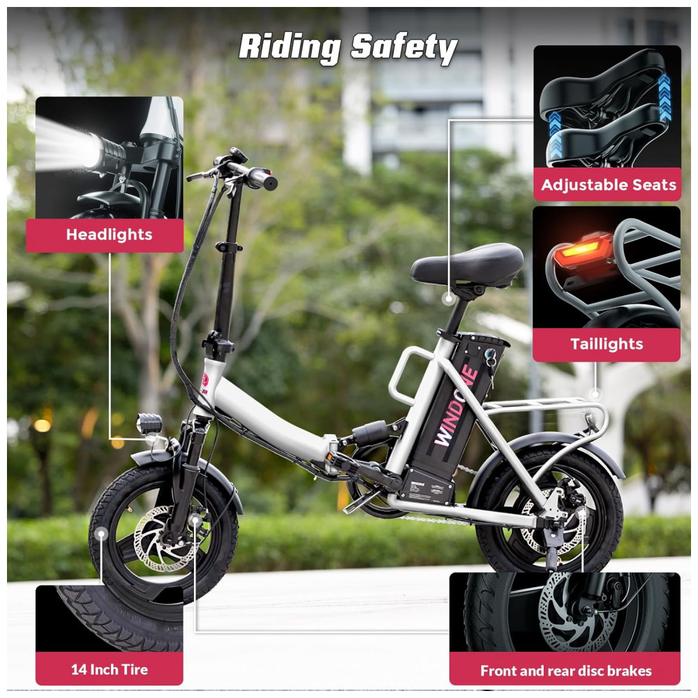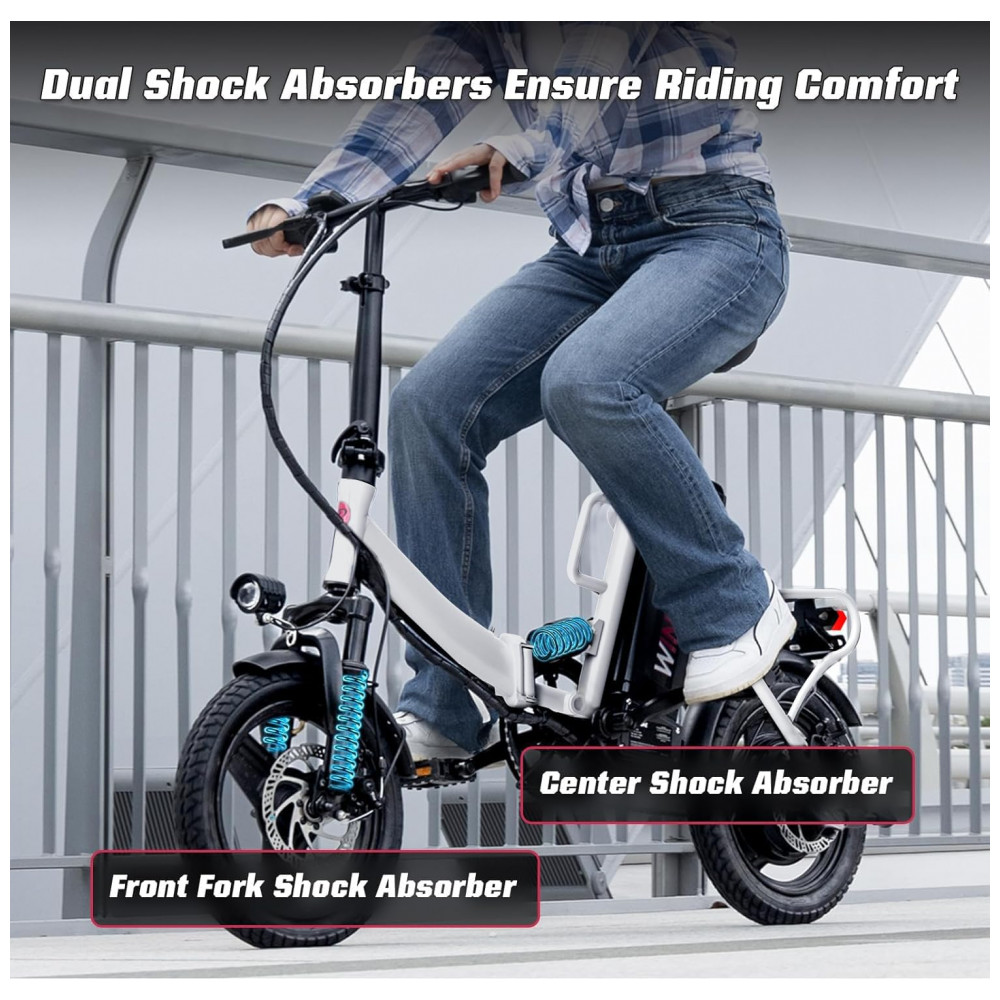 Eficiência sem Esforço! Equipada com um potente motor de 350W (pico de 500W), a bicicleta elétrica Windone S14 oferece uma experiência de pedalada perfeita com autonomia de até 45 km com assistência de pedal. Projetada para desempenho e confiabilidade, garante aceleração suave e deslocamentos sem esforço. Além disso, atende aos mais altos padrões de segurança com certificação UL 2849. Velocidade com Segurança! Cruze confortavelmente a até 30 km/h, garantindo sua segurança com freios a disco dianteiros e traseiros que oferecem potência de frenagem confiável quando você mais precisa. Conforto Resistente! Experimente uma pedalada mais suave com o garfo dianteiro e amortecedores centrais, absorvendo cada solavanco e impacto, proporcionando o máximo de conforto em qualquer terreno. Design Adaptável! Com pneus de 14 polegadas e assento ajustável, a bicicleta elétrica dobrável foi projetada para oferecer conforto e adaptabilidade ideais, atendendo a uma ampla gama de ciclistas e preferências. Desempenho Duradouro! Equipada com uma bateria removível de 36V 7,8Ah, desfrute de passeios prolongados sem se preocupar com a falta de energia, e com tempo de carregamento de 5-6 horas, você estará de volta à estrada em pouco tempo.