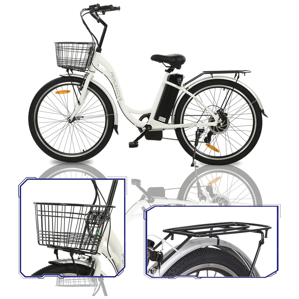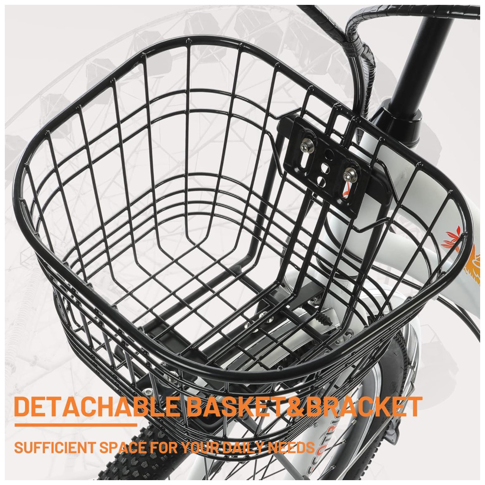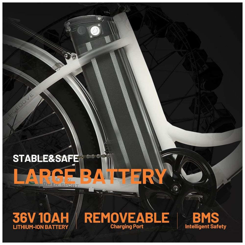 BATERIA REMOVÍVEL PODEROSA – Com um estilo Step-through, você pode facilmente pedalar esta bicicleta elétrica para o trajeto diário, ir a uma cafeteria com os amigos ou fazer um piquenique com a família. A bateria removível grande de 36 V 10 AH é potente o suficiente para essas atividades. A e-bike percorre de 34 a 64 km após um carregamento de 5 a 8 horas, com bateria de longa duração.