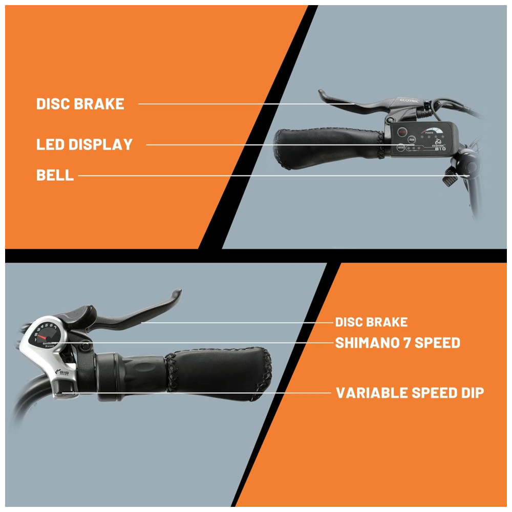 VISOR DE LED – A bicicleta elétrica possui um visor de LED de 36 V, que permite escolher entre três modos de assistência quando o motor está funcionando: baixo, médio e alto. Além disso, você também pode ver a carga da bateria no lado direito. Há quatro luzes. Uma delas lembra que a bateria precisa ser carregada.