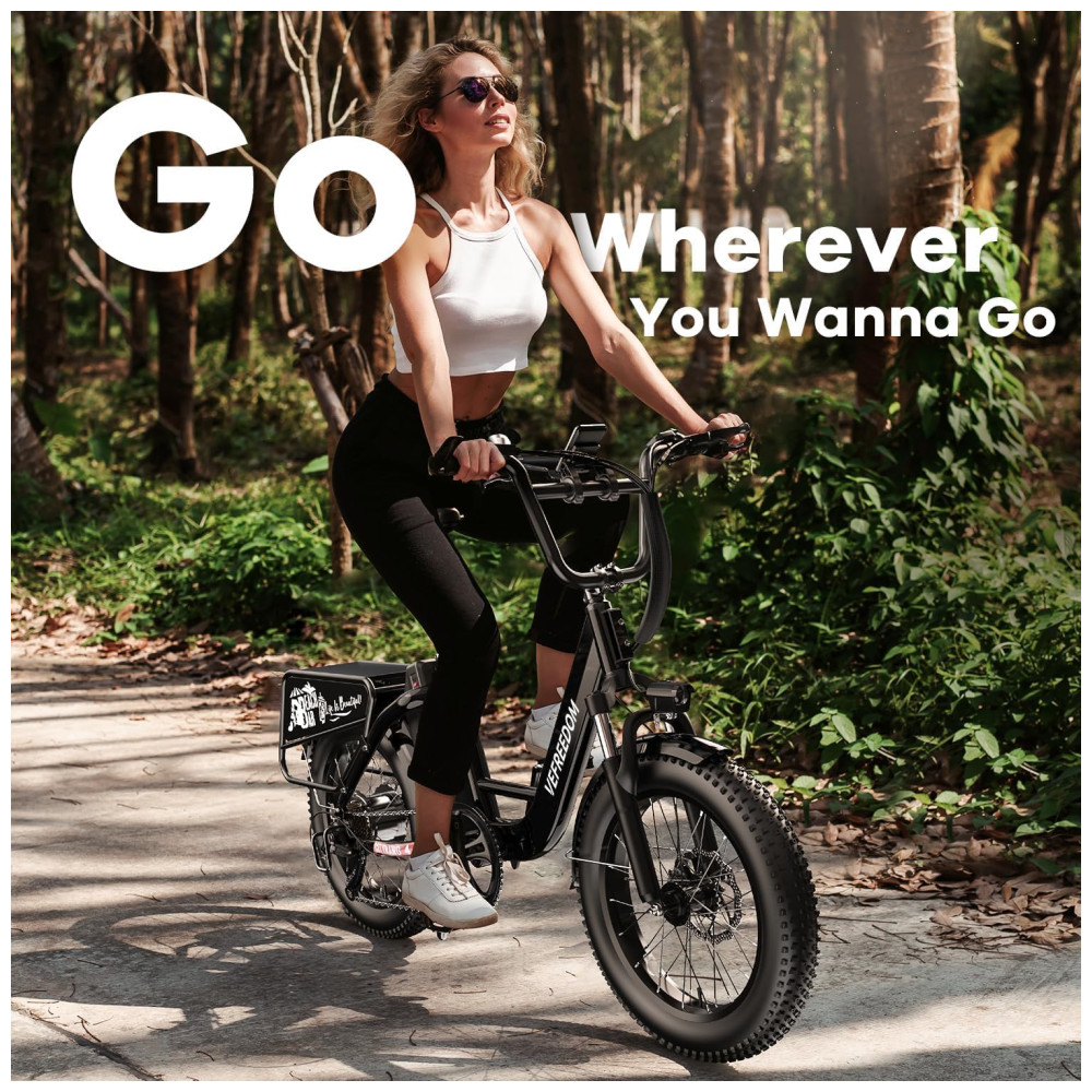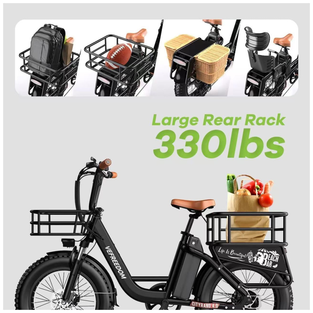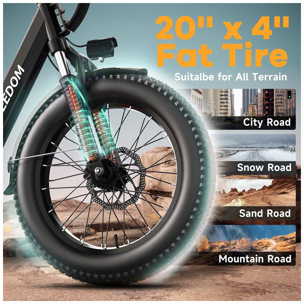 A bicicleta elétrica EUY para adultos oferece alta velocidade com motor sem escova de 750W de pico 1500W e transmissão de 7 velocidades, tornando subidas íngremes e longos passeios uma brisa, alcançando até 30MPH e 70 milhas. Com bateria de lítio removível impermeável de 48V 20 Ah, garante uma autonomia de 70 milhas no modo pedal assistido e 30 milhas no modo elétrico. Equipada com suspensão dianteira, freios a disco duplo e pneus 20×4.0, oferece excelente absorção de choque. Possui 5 modos de pilotagem e display colorido HD que mostra velocidade, níveis de assistência, quilometragem, entre outros. Ideal para deslocamentos urbanos e lazer.