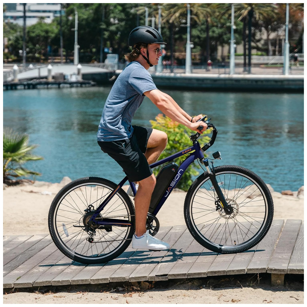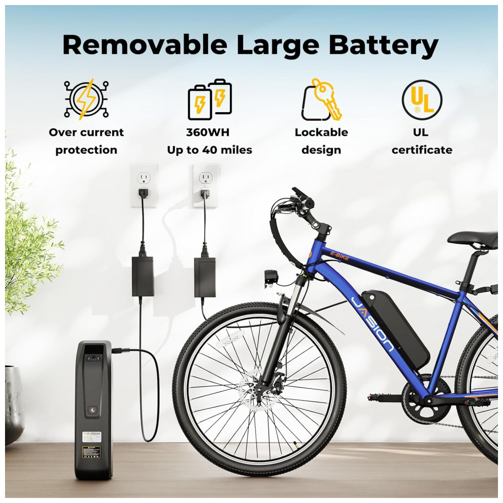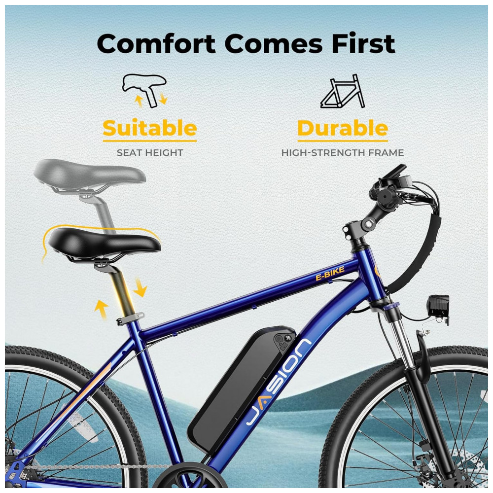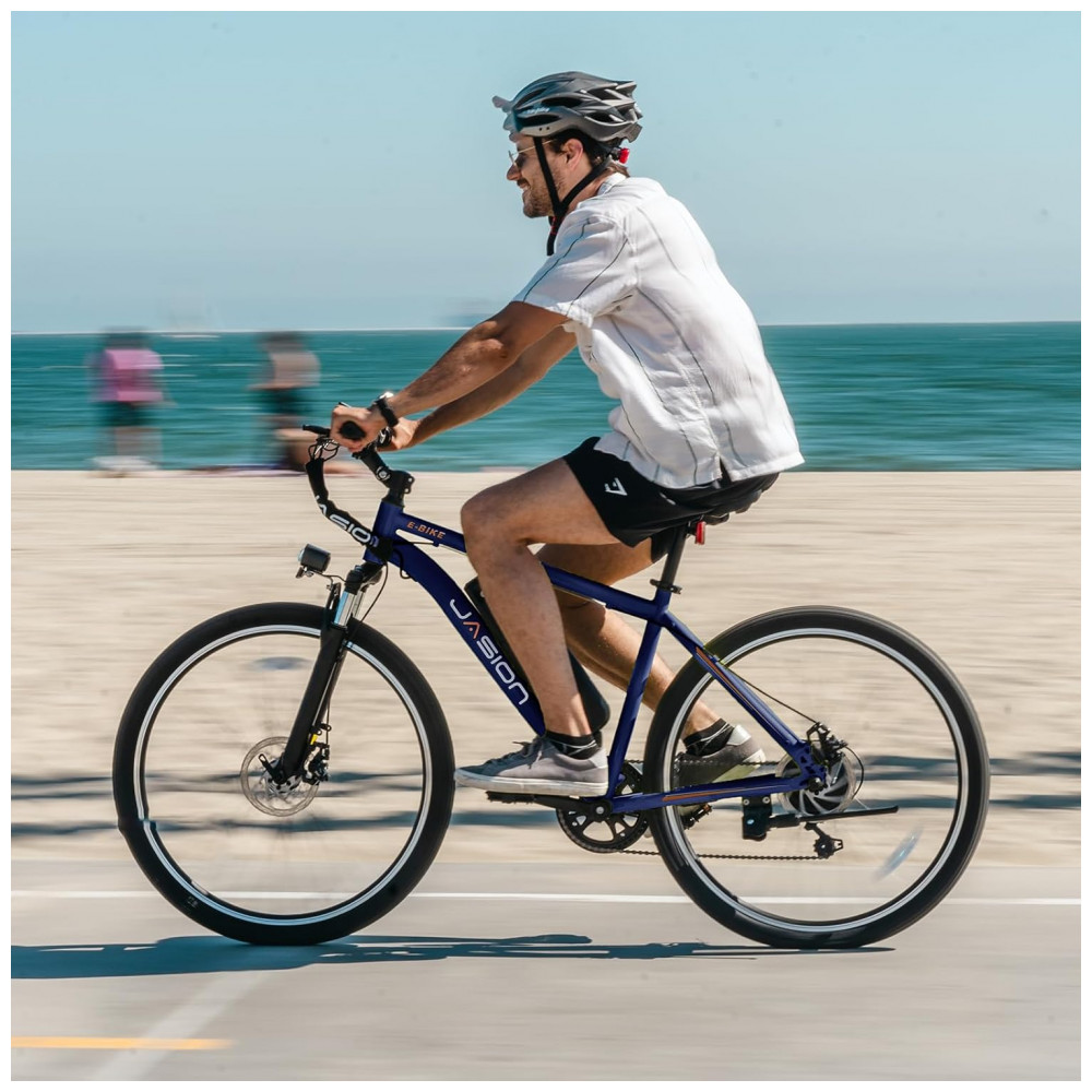 A bicicleta elétrica Jasion EB5 na cor azul é indicada para uso adulto em deslocamentos urbanos e trajetos com relevo variado, combinando motor elétrico brushless com potência de pico de 1000W e quadro em aço carbono de alta resistência. A bateria de íons de lítio removível com 360Wh oferece autonomia estimada entre 40 e 64 km por carga, com tempo de recarga em torno de 5 a 6 horas, adequada para uso diário em percursos de ida e volta.