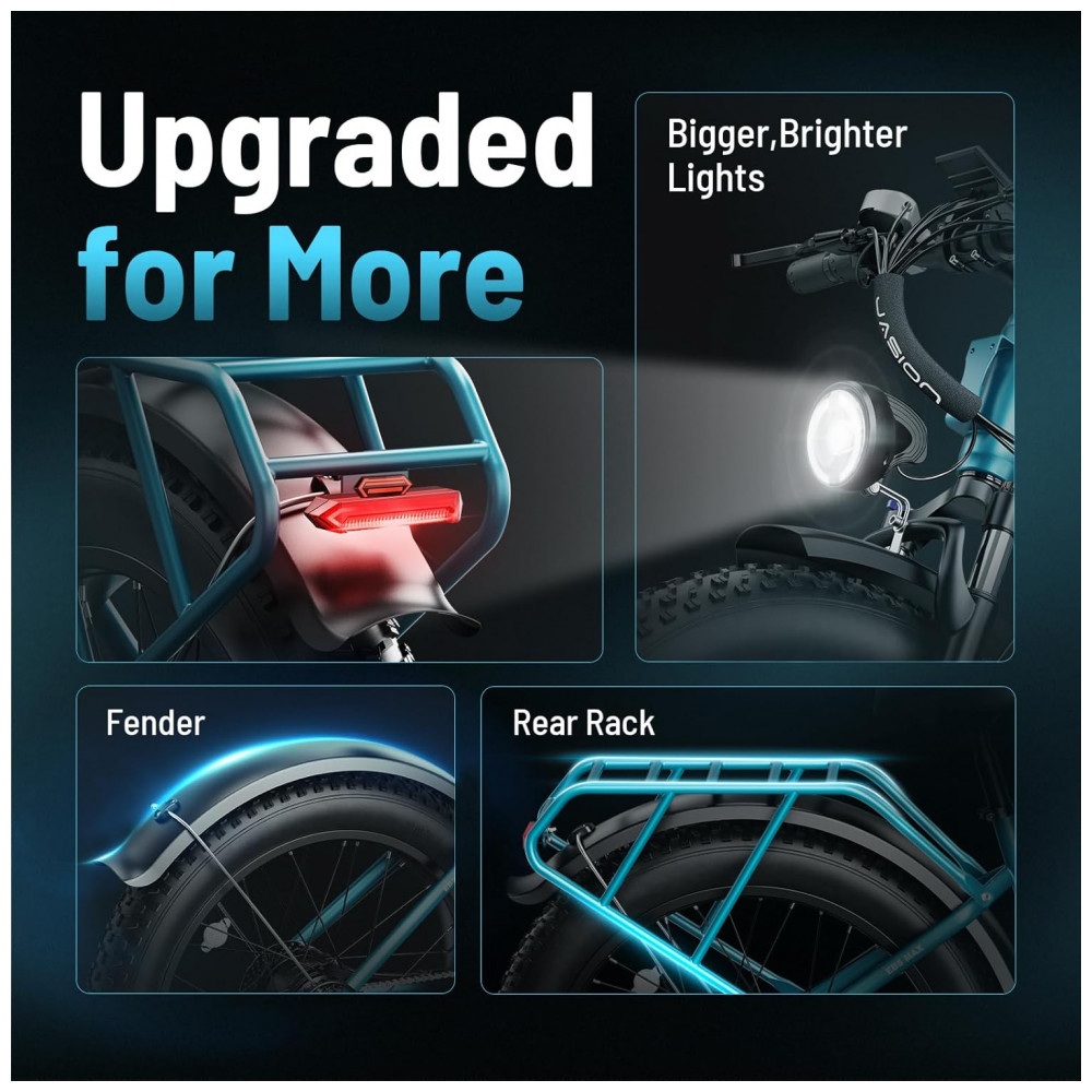 Conteúdo da embalagem: 1 bicicleta elétrica Jasion EB5 MAX azul, 1 farol dianteiro, 1 kit de ferramentas, 1 manual do usuário