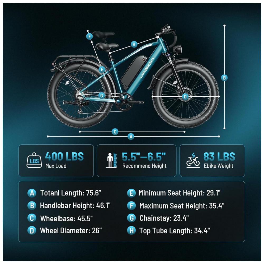 A bicicleta elétrica Jasion EB5 MAX azul é uma e-bike de montanha com pneus largos 26×4, indicada para uso adulto em trilhas, estradas de terra e deslocamentos urbanos de média distância. O quadro em aço carbono com suspensão dianteira e pneus fat oferece maior estabilidade, tração e absorção de impactos em superfícies como areia, lama, cascalho e pavimento molhado.