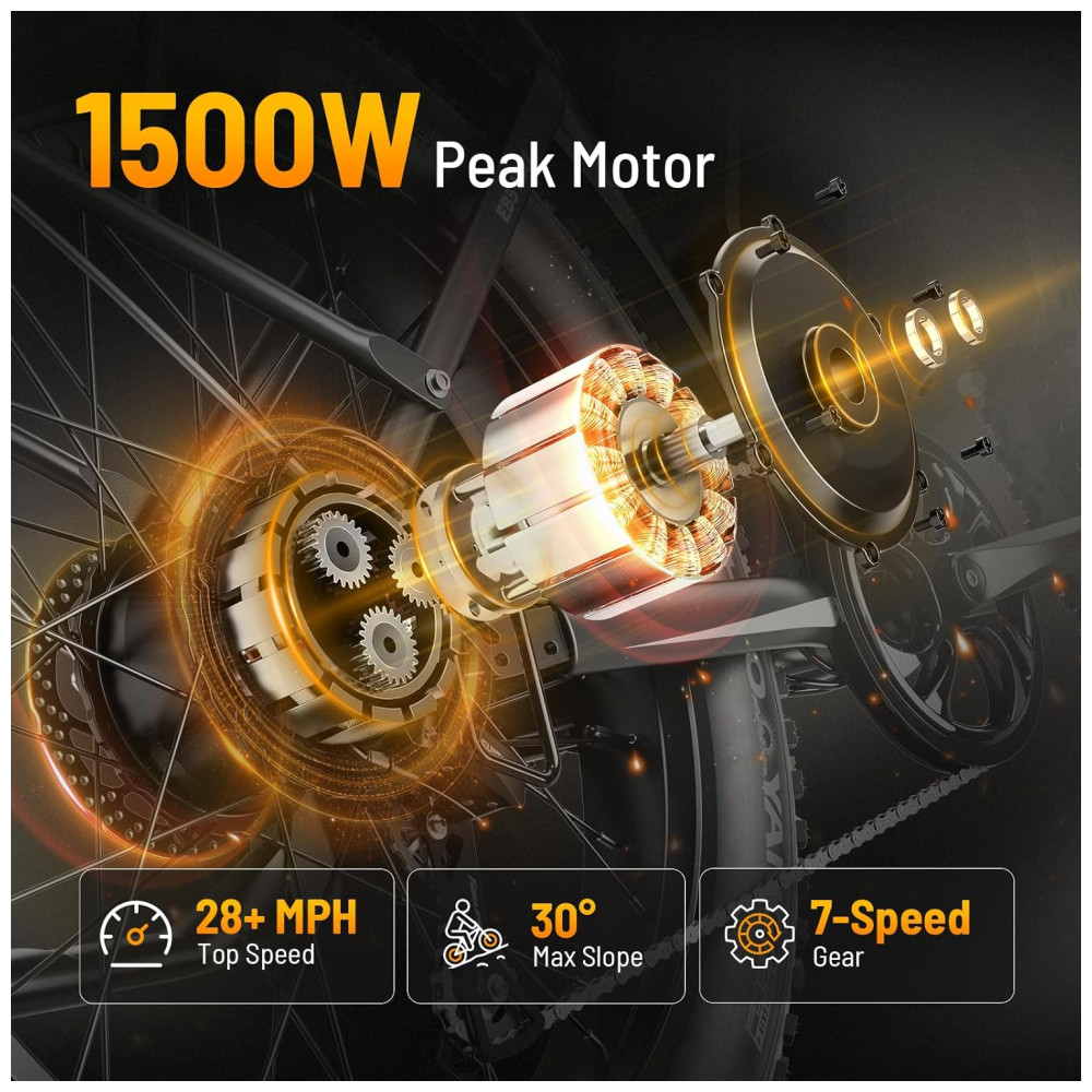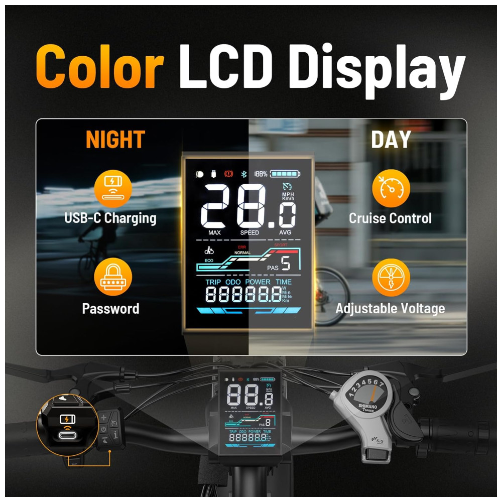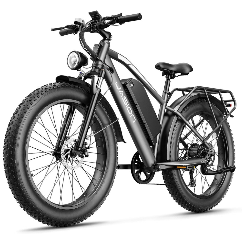 Desfrute de toda potência com a bicicleta elétrica Jasion EB5 MAX, equipada com um motor de pico de 1500W que atinge velocidades de até 45 km/h com facilidade. Supere subidas íngremes com facilidade, graças à sua capacidade robusta de escalada. Com uma bateria de 48V 15Ah, percorra até 104 km com assistência e 56 km no modo acelerador. O design removível e travável da bateria garante conveniência e segurança. Tenha total visibilidade com o display colorido, que mostra estatísticas em tempo real e oferece controle de cruzeiro. As luzes dianteiras e traseiras maiores proporcionam maior segurança, principalmente em condições de pouca luz. Com pneus largos de 26 x 4.0 polegadas, a EB5 MAX oferece excelente aderência em diferentes terrenos, enquanto o garfo de suspensão absorve impactos, garantindo conforto. Com capacidade para transportar itens essenciais, essa bicicleta é ideal para uso diário ou aventuras.