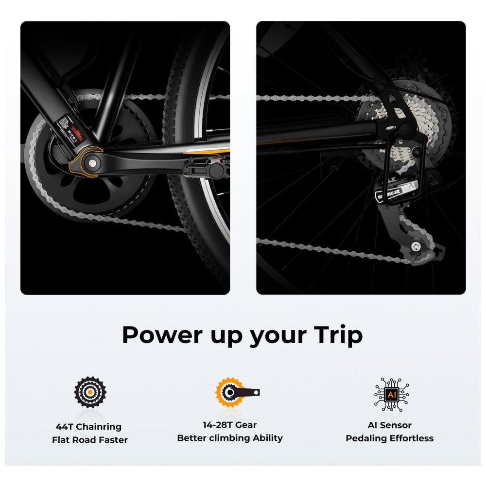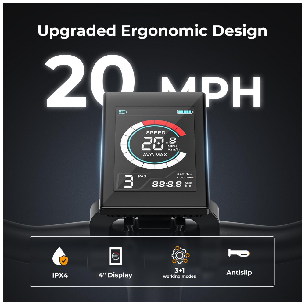 O sistema elétrico trabalha com modos de operação selecionáveis: pedal assistido com até 3 níveis de assistência, modo elétrico puro via acelerador, pedal convencional e modo de impulso entre 4,5 e 7,5 km/h para apoio ao empurrar a bicicleta em subidas. O display LCD com retroiluminação ajustável em 5 níveis apresenta velocidade média e máxima, odômetro, nível de assistência e demais dados relevantes para o controle do uso.