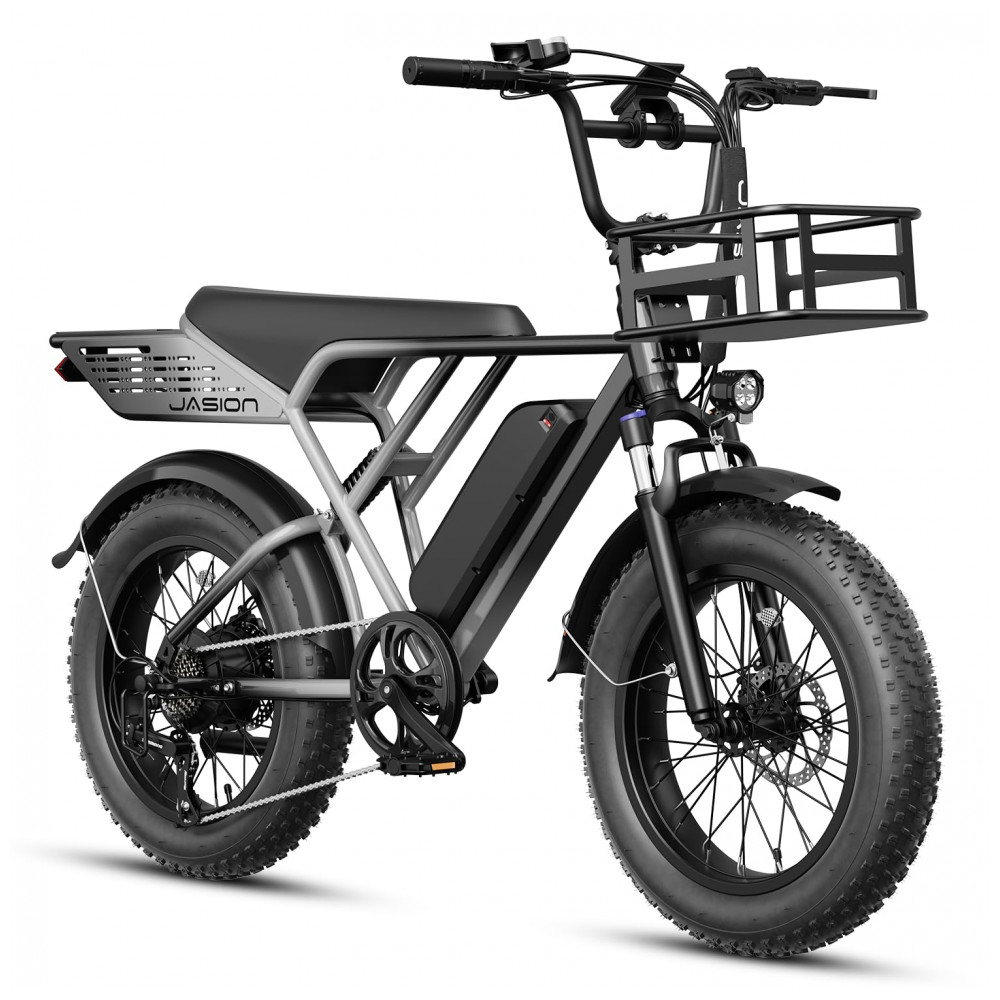 Bicicleta elétrica Jasion RetroVolt cinza com cesta dianteira pneus 20×4 suspensão dupla motor 1500W pico bateria 48V 13Ah 70 km 7 marchas 110V
