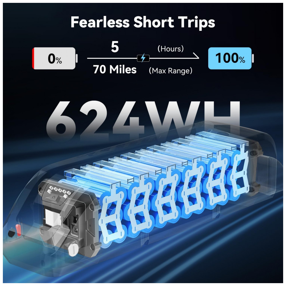 A alimentação elétrica é feita por bateria de íons de lítio 48V 13Ah (energia aproximada de 624Wh), removível e com proteção IPX6, permitindo recarga tanto instalada no quadro quanto fora da bicicleta. Em modo de pedal assistido (PAS), a autonomia pode chegar a cerca de 112 km por carga, variando conforme o perfil do trajeto, o nível de assistência selecionado e as condições de uso. O tempo de recarga típico é de aproximadamente 4 horas com o carregador fornecido.