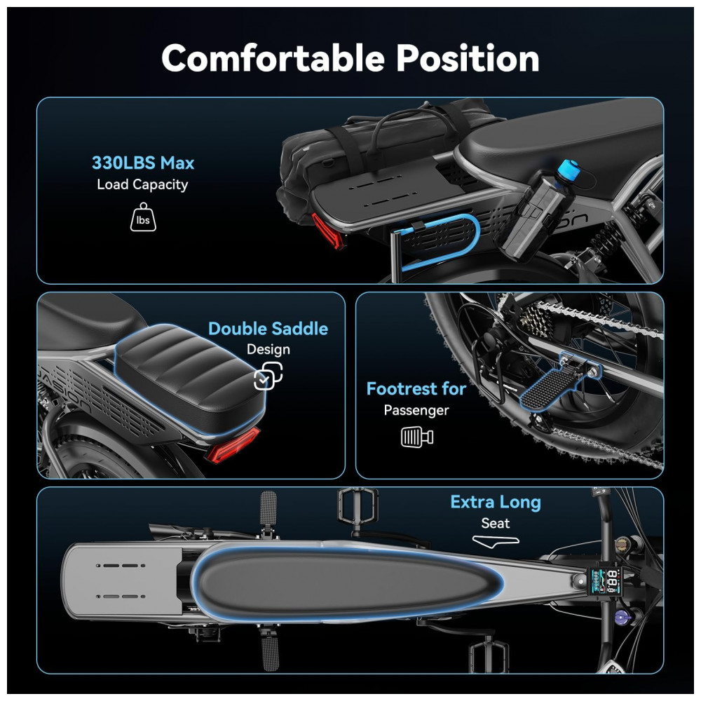 O quadro foi dimensionado para suportar carga máxima em torno de 204 kg, abrangendo usuário e carga transportada na cesta ou em suportes adicionais. A geometria atende principalmente usuários com altura aproximada de 1,60 m a 1,88 m, oferecendo posição de pilotagem mais ereta e confortável em percursos médios e longos. A bicicleta é equipada com farol dianteiro, lanterna traseira e painel LCD com indicação de velocidade, nível de bateria e modo de assistência.