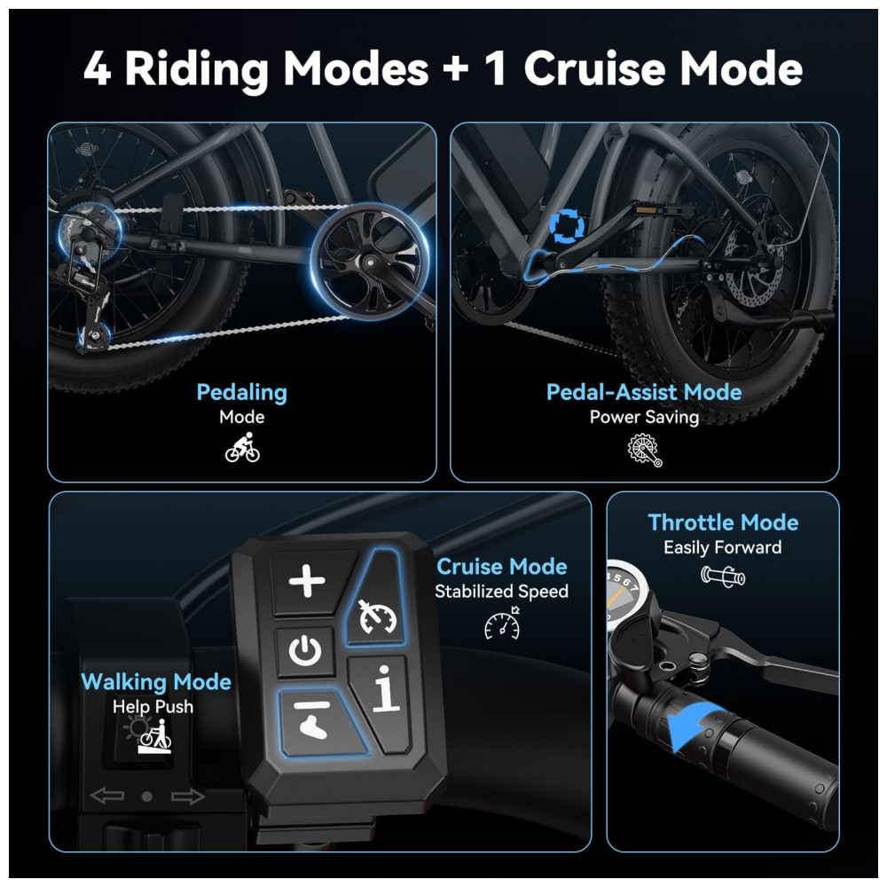 Tipo de assistência elétrica: Pedal assistido, acelerador, pedal livre e modo cruzeiro