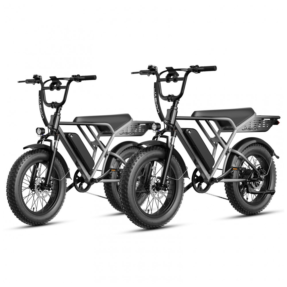 Bicicleta elétrica Jasion RetroVolt kit 2 unidades cinza pneus 20×4 suspensão dupla motor 1500W pico bateria 48V 13Ah 70 km 7 marchas 110V