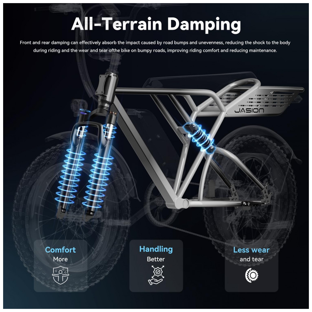 Bicicleta elétrica Jasion RetroVolt prata-cinza pneus 20×4 motor 750W pico 2000W bateria 48V 13Ah 7 marchas suspensão dupla freios disco duplo 110V