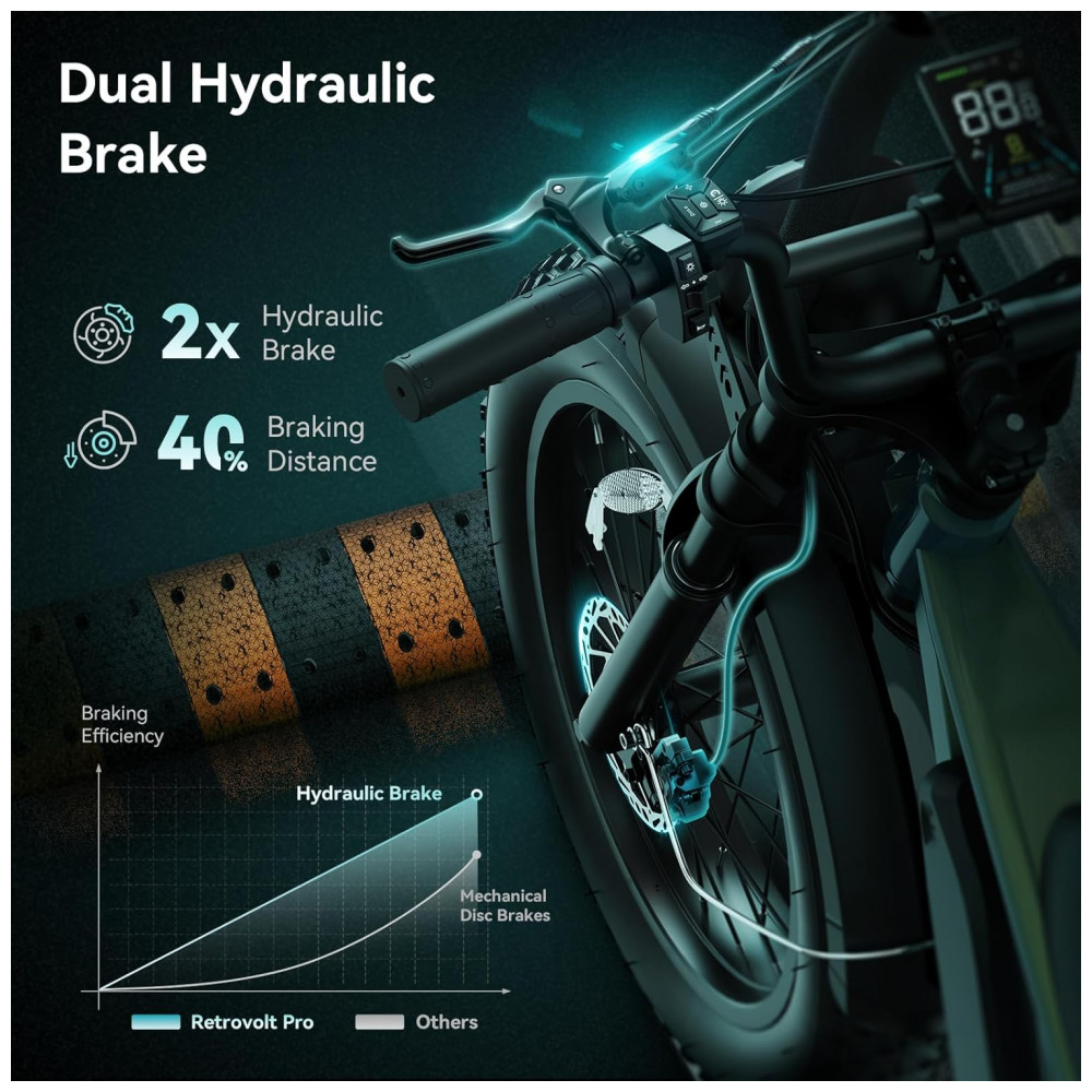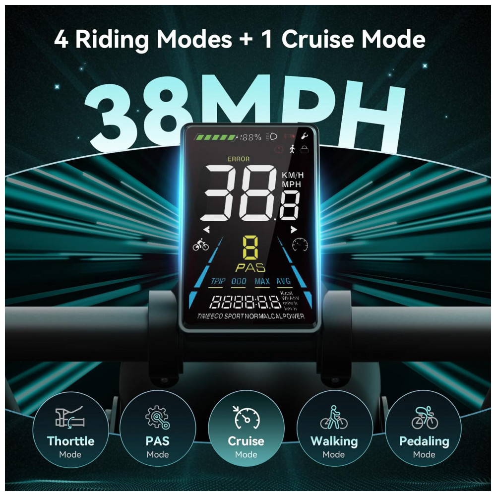 Os freios a disco hidráulicos duplos garantem frenagem responsiva em condições úmidas ou secas, suportados por chassi com capacidade total de 150 kg incluindo ciclista e carga no rack traseiro multifuncional. O display LCD colorido central exibe velocidade, bateria, modo ativo e odômetro em tempo real, complementado por farol LED frontal e para-lamas para proteção contra elementos.