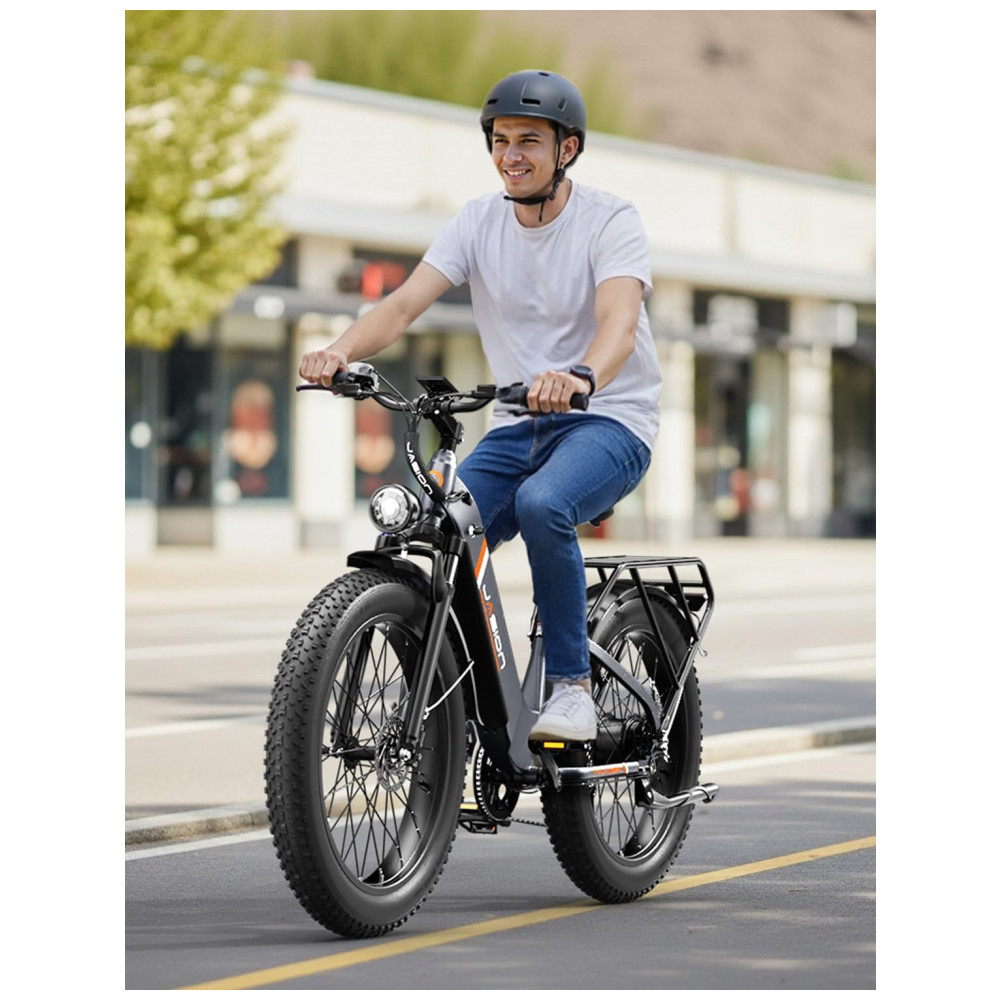 A bicicleta elétrica Jasion Thunder azul ártico é uma fat bike elétrica para adultos com pneus 26×4, quadro em alumínio e motor traseiro brushless de 750W de potência nominal e 1800W de potência de pico, indicada para uso em cidade, estradas de terra, neve, areia e trilhas leves. A bateria de íons de lítio de 48V 18Ah, com 864Wh de energia, é removível e recarregável, oferecendo autonomia de até cerca de 80 km em modos de assistência mais econômicos, variando conforme o nível de assistência, o relevo e o peso do usuário.