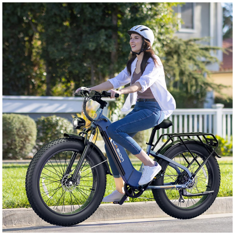 Os pneus 26×4 aumentam a área de contato com o solo, oferecendo tração em superfícies irregulares como cascalho, neve e areia, além de maior estabilidade em uso urbano. A suspensão dianteira auxilia na absorção de impactos em pisos com desníveis, enquanto os freios a disco hidráulicos nas duas rodas favorecem frenagens mais progressivas em diferentes condições climáticas e de velocidade.