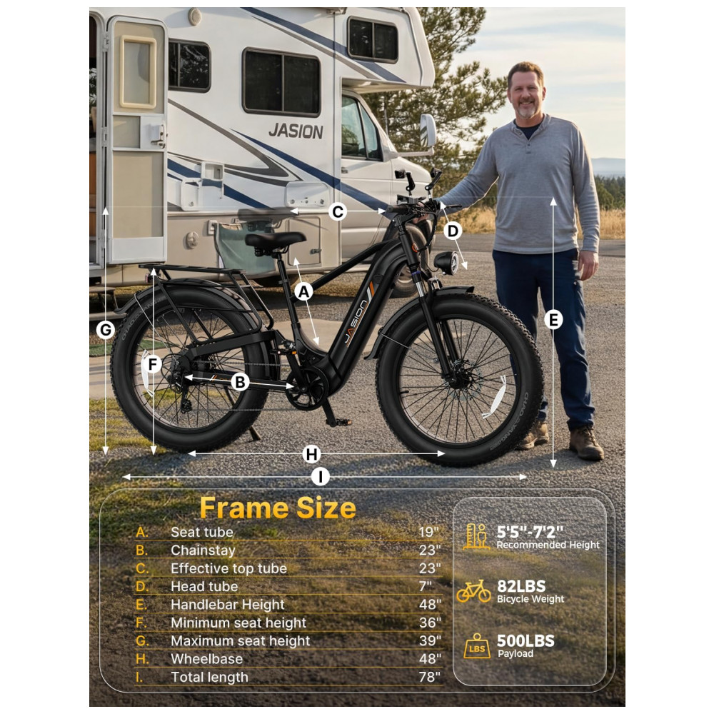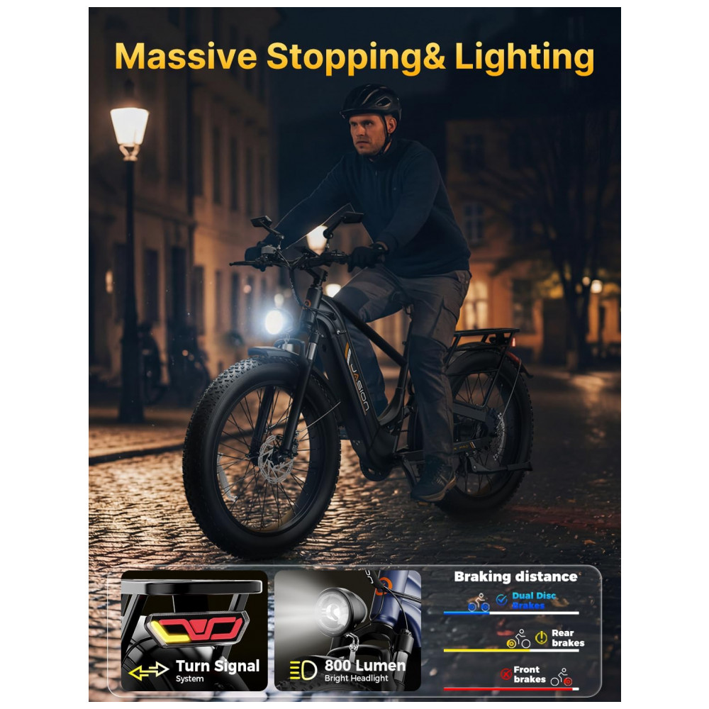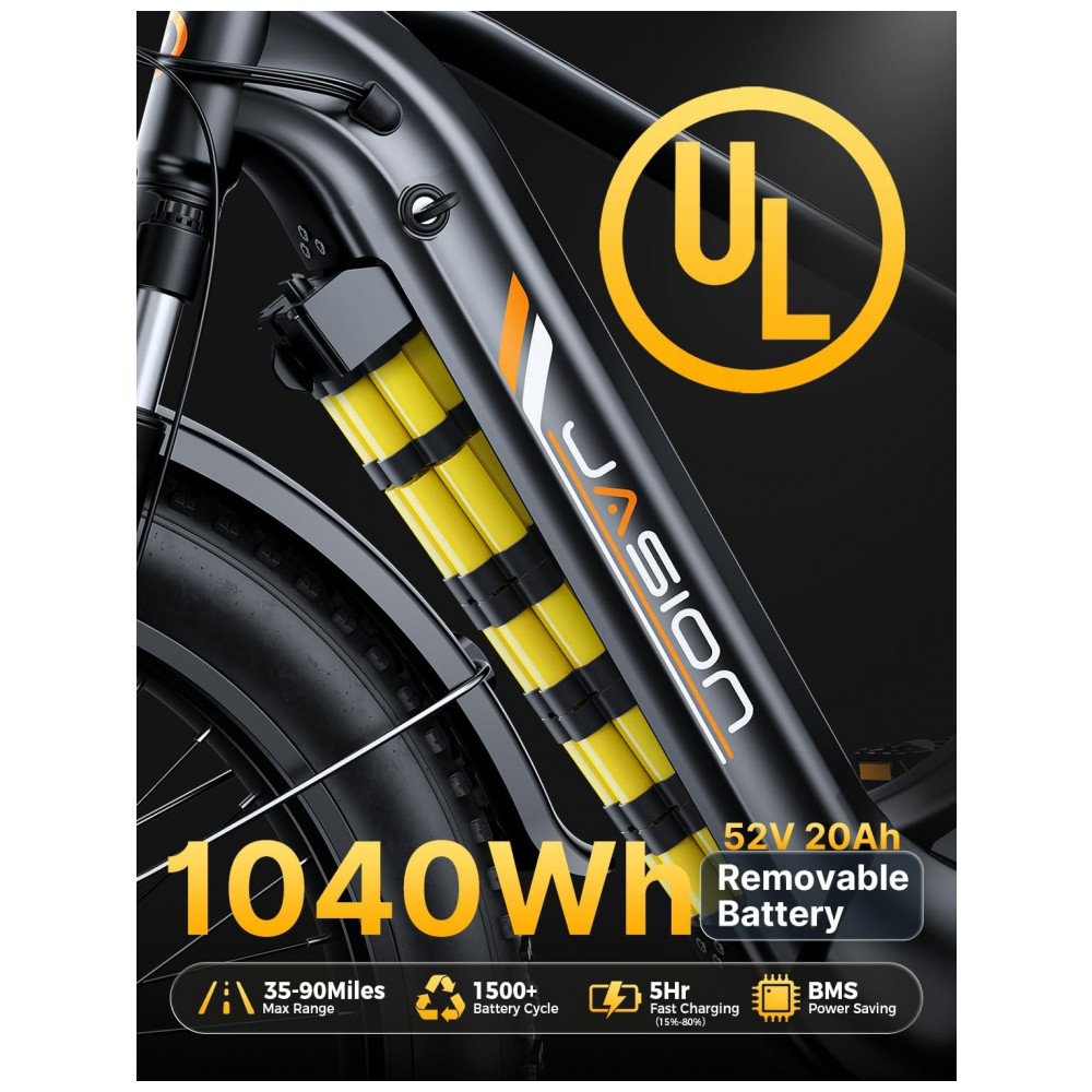 A bicicleta elétrica Jasion Thunder PRO preto obsidian é uma fat bike elétrica para adultos com pneus 26×4, quadro robusto e motor traseiro com aproximadamente 750W de potência nominal e até 1800W de potência de pico, indicada para uso em cidade, estradas de terra, neve, areia e trilhas leves. A bateria de íons de lítio de 48V 18Ah, com 864Wh de energia, é removível e recarregável, oferecendo autonomia que pode chegar a cerca de 80 km em modos de assistência mais econômicos, variando conforme o nível de assistência, o terreno e o peso do usuário.