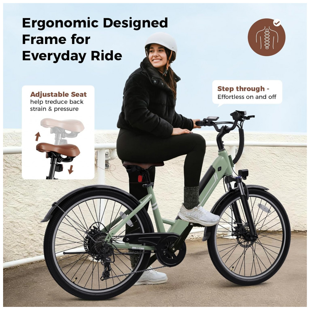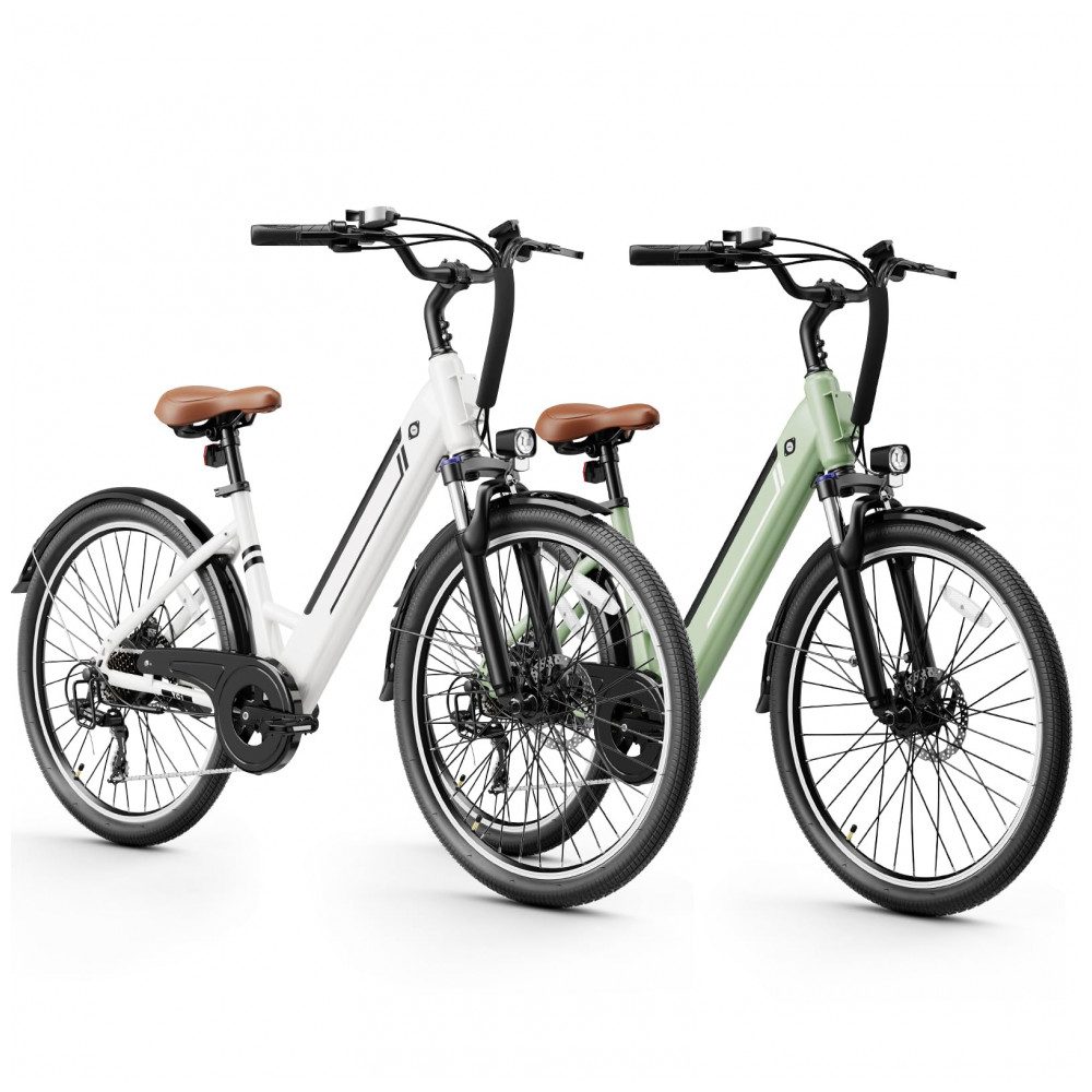 A bicicleta elétrica Jasion YC1 ST na combinação verde e branco é indicada para adultos em deslocamentos urbanos, estradas e trilhas leves, unindo quadro em aço carbono de alta resistência e motor brushless com potência de pico de 1200W. A bateria interna removível de íons de lítio com 360Wh, gerenciada por sistema BMS, pode ser recarregada em cerca de 5 a 6 horas e oferece autonomia de até aproximadamente 80 km em modo de assistência de pedal, variando conforme o peso do usuário, o relevo e o modo selecionado.