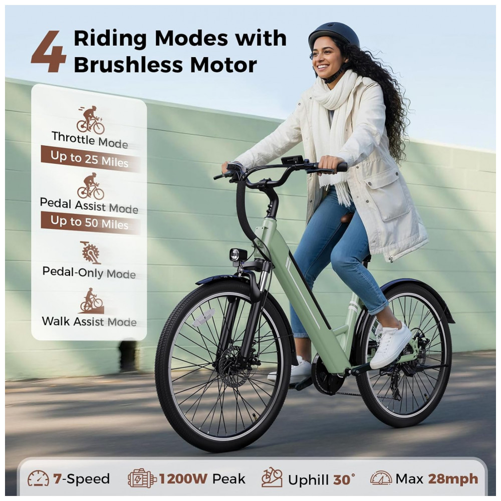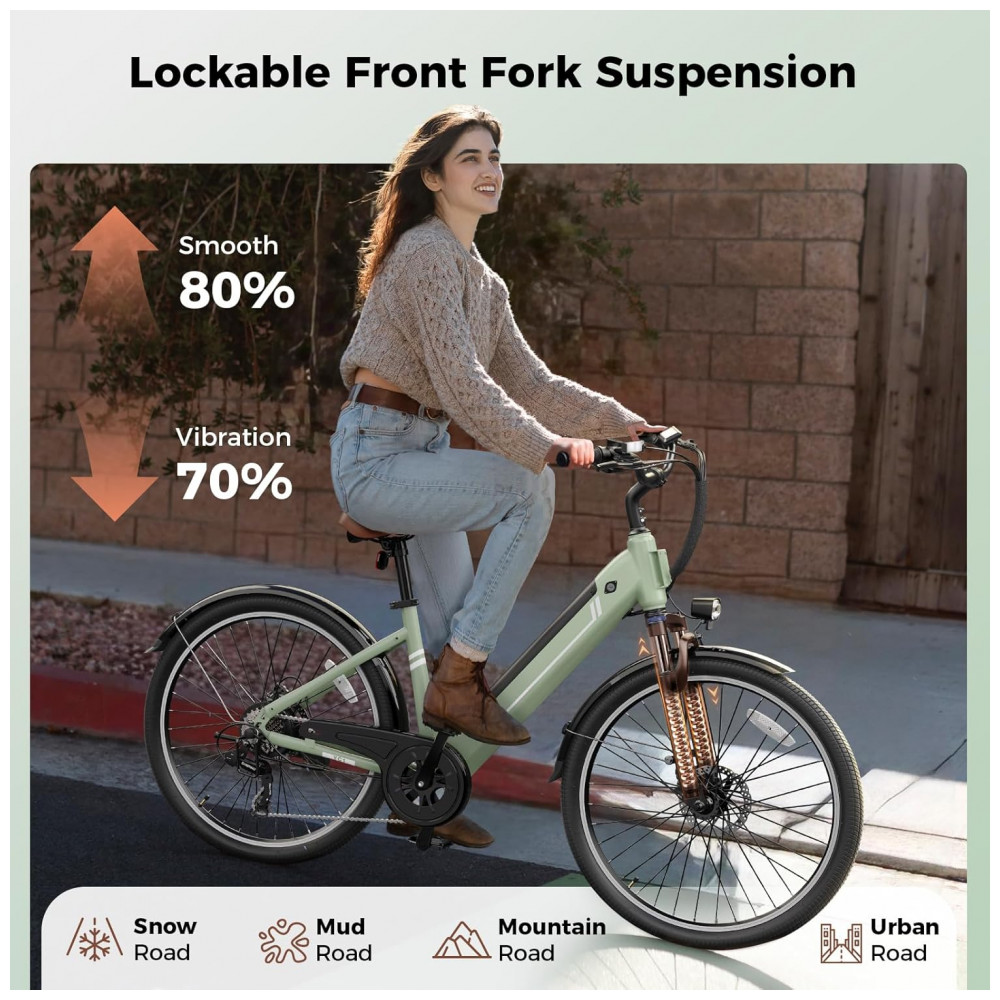 Bicicleta Elétrica Jasion YC1 ST Verde e Branco 1200W Motor Brushless Bateria Interna Removível 360Wh Pneus 66cm 7 Marchas Suspensão Dianteira 110V