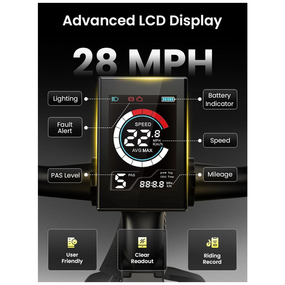 O sistema de assistência elétrica do tipo pedelec oferece cinco níveis de assistência ao pedal, além de modos elétrico, combinado e apenas pedal, permitindo ajustar o esforço em subidas, retas e longas distâncias. O display LCD indica velocidade, distância percorrida, nível de carga da bateria e nível de assistência selecionado, auxiliando no controle do uso de energia e planejamento dos trajetos.