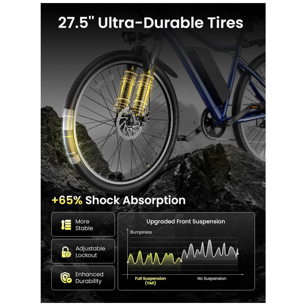 A suspensão dianteira com função de travamento contribui para o conforto em pisos irregulares, absorvendo impactos em desníveis e trechos de terra. As rodas 27,5 com pneus largos ajudam na aderência em diferentes superfícies, enquanto os freios a disco duplos atuam na frenagem em condições secas e úmidas.