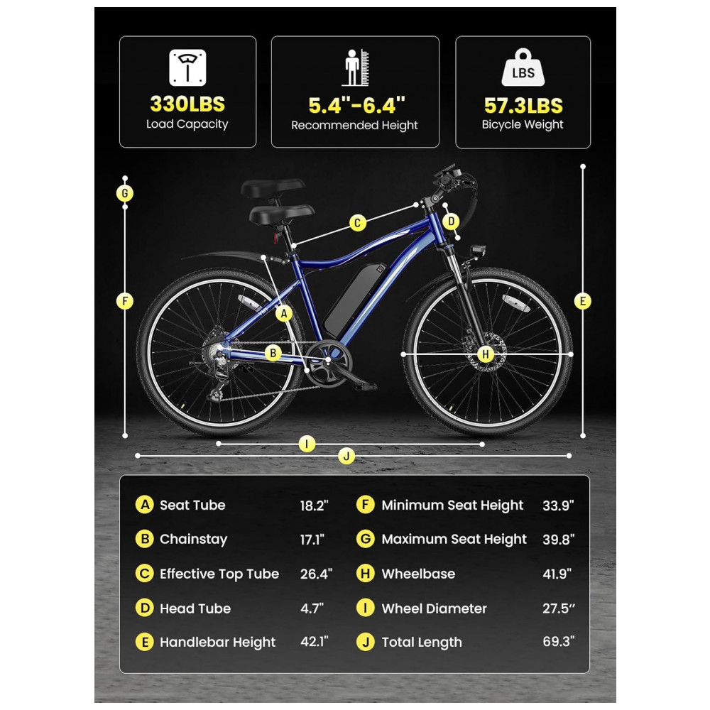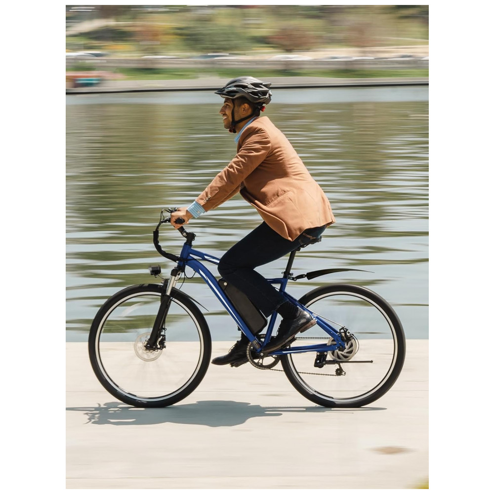 A bicicleta elétrica Jasion YM1 azul marinho é uma mountain bike elétrica para adultos com pneus 27,5 resistentes a perfurações, quadro em aço carbono e motor elétrico com 750W de potência de pico, desenvolvida para trilhas leves e deslocamentos urbanos. A bateria de íons de lítio de 48V 10Ah, com 480Wh de energia, é removível e permite recarga fora da bicicleta, oferecendo autonomia estimada entre aproximadamente 40 e 80 km em modo pedal assistido, conforme nível de assistência utilizado, peso do ciclista e características do trajeto.