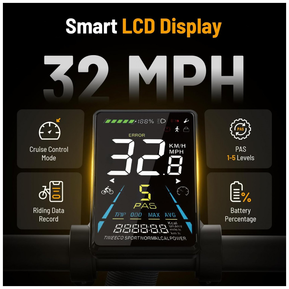 Os freios a disco hidráulicos dianteiro e traseiro contribuem para frenagens mais progressivas e controladas em diferentes condições climáticas e de velocidade. O display LCD apresenta informações como velocidade, nível de bateria, modo de assistência e distância percorrida, enquanto o sistema de iluminação e refletores melhora a visibilidade em ambientes com baixa luz.