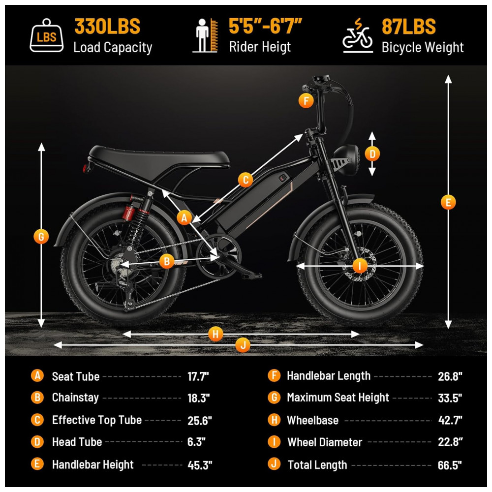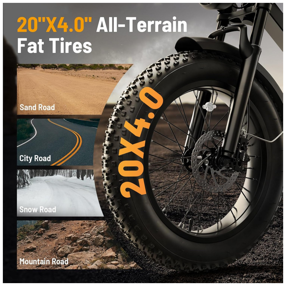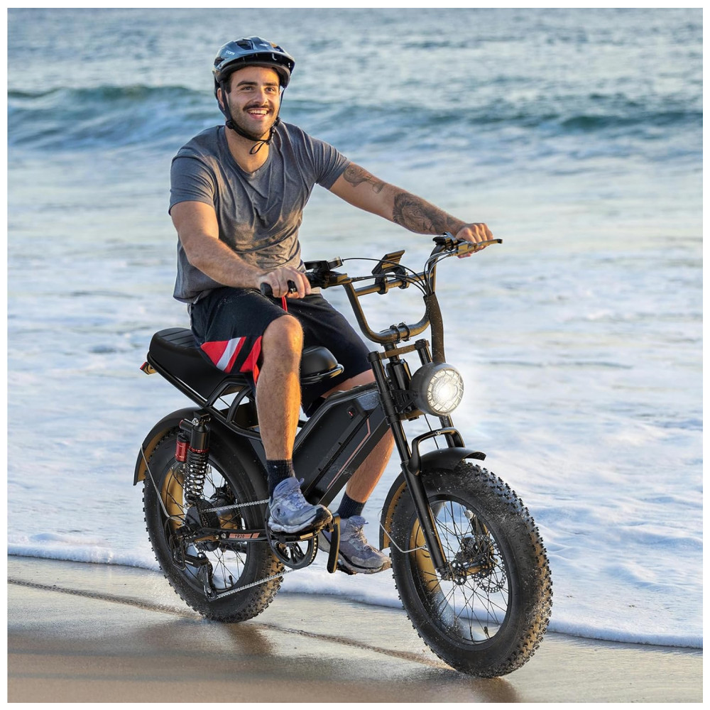 O sistema de assistência elétrica combina modos de pedal assistido, acelerador e modo totalmente elétrico com transmissão de 7 marchas, permitindo ajustar o apoio do motor e a cadência de pedal nas diferentes condições de uso. A suspensão dupla, com garfo dianteiro e amortecedores traseiros, em conjunto com os pneus 20×4, auxilia na absorção de impactos em pisos irregulares, favorecendo conforto e controle em percursos urbanos e trilhas.