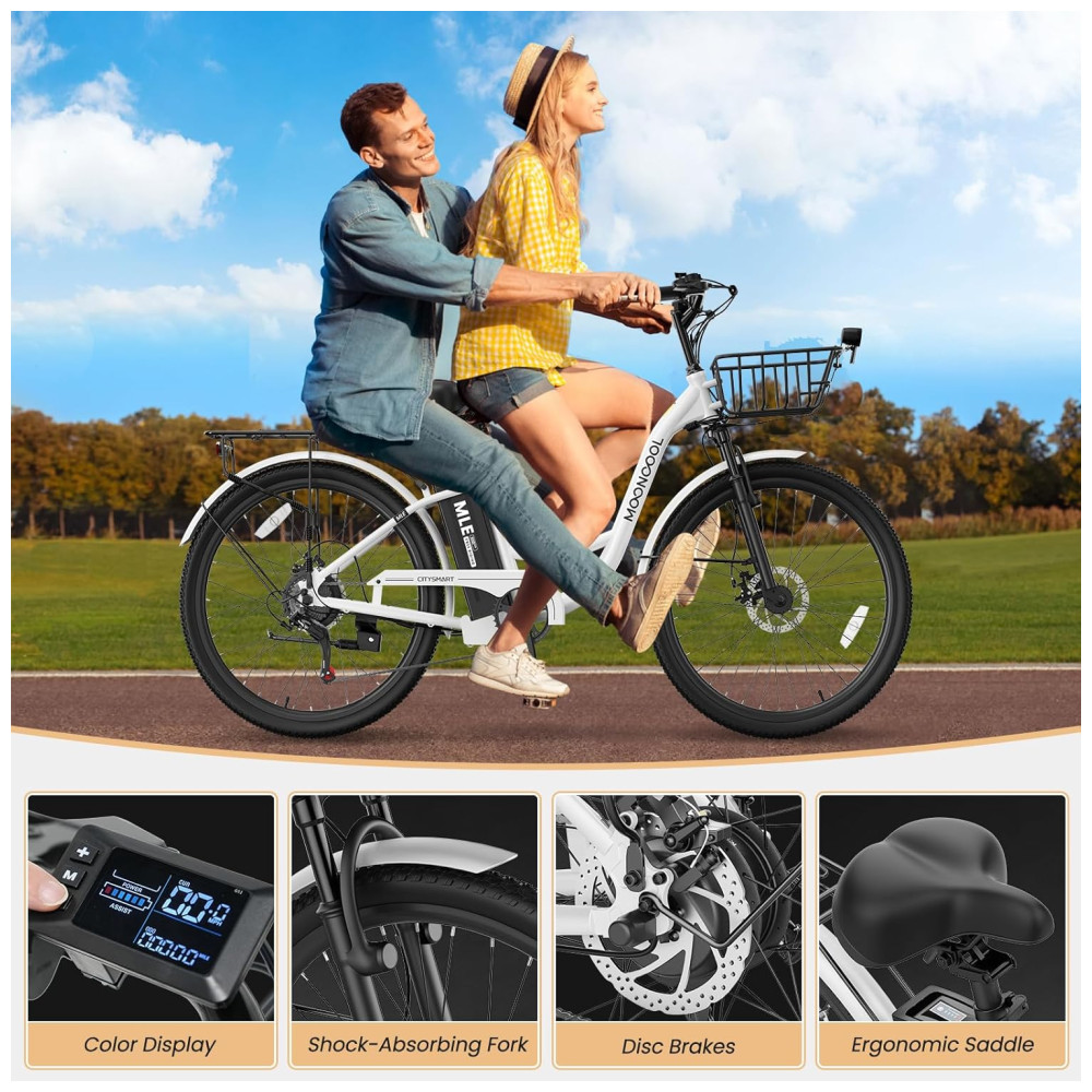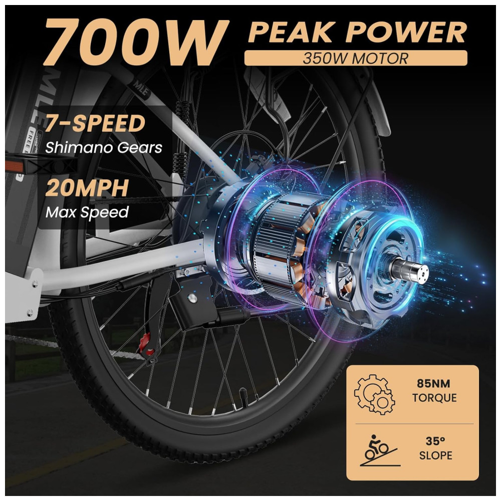Bicicleta elétrica para adultos com motor de pico 700W, bateria removível 36V 10,4Ah e autonomia de até 64 km. Quadro em alumínio 6061, 7 marchas, tela LCD colorida e certificação UL2849 garantem desempenho, segurança e conforto em qualquer trajeto.