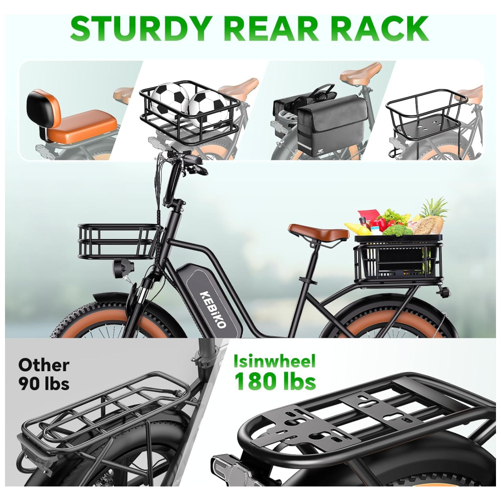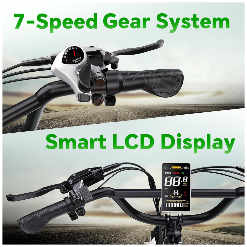 A bicicleta elétrica urbana com assento de passageiro está equipada com uma bateria de lítio gigante, proporcionando uma autonomia de 80 milhas no modo PAS, permitindo que você se livre do incômodo da carga frequente e desfrute das aventuras de pedal mais ambiciosas. Perfeita para deslocamentos diários. Seu design removível permite que a bateria seja facilmente retirada da bicicleta elétrica e carregada em ambientes internos. Equipada com um motor de pico de 1000W sem escovas, oferecendo forte capacidade de escalada e potência suficiente para superar facilmente uma inclinação de 30 graus, com velocidade máxima de 30 mph no modo elétrico puro. A suspensão dianteira de liga de alumínio excelente e pneus largos à prova de furos de 20″x4.0″ proporcionam um passeio suave e confortável. Freios a disco de liga de alumínio de 180 mm na frente e atrás garantem controle preciso e eficaz em vários terrenos e condições de pilotagem. Equipada com uma caixa de câmbio de 7 velocidades, você terá uma escalada rápida e responsiva, proporcionando a melhor experiência de pilotagem em bicicleta elétrica. Possui um display LCD colorido multifuncional e 3 modos de pilotagem. Além disso, nossa ebike vem com um assento traseiro e almofada, além de uma cesta frontal dobrável para colocar alguns itens diários. Naturalmente, você também pode comprar acessórios, como outras cestas ou cadeirinhas, conforme necessário, para personalizar sua própria bicicleta elétrica. Perfeito para pais que desejam desfrutar do tempo em família ao ar livre enquanto levam seus filhos. 90% de nossas bicicletas elétricas são pré-montadas, economizando seu tempo de instalação. Comprometemo-nos a oferecer uma garantia de 365 dias e um atendimento ao cliente ágil para garantir sua satisfação. Se tiver alguma dúvida sobre a bicicleta de montanha elétrica, fique à vontade para nos contatar. Nota: por favor, mantenha a embalagem por um tempo.