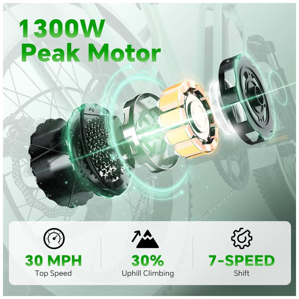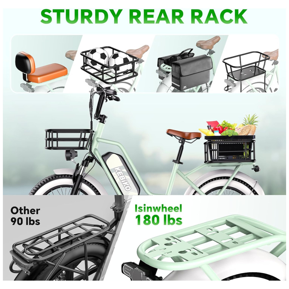 A bicicleta elétrica para deslocamentos urbanos com assento para passageiro é equipada com uma gigantesca bateria de lítio, proporcionando uma autonomia de cruzeiro de 80 milhas no modo PAS, eliminando a frequente necessidade de carga. Com design destacável, a bateria pode ser facilmente removida para recarga em ambientes internos. O motor sem escovas de pico de 1000W proporciona grande capacidade de escalada e potência, superando facilmente inclinações de 30° e atingindo velocidade máxima de 30 mph no modo puramente elétrico. Os amortecedores dianteiros de liga de alumínio garantem excelente absorção de impacto, enquanto os pneus largos 20″ x 4.0″ à prova de furos proporcionam uma condução suave e confortável. Freios a disco de liga de alumínio 180mm na frente e atrás garantem controle preciso e eficaz em diversas condições de terreno. Com um câmbio de 7 velocidades, você terá uma escalada rápida e responsiva, proporcionando a melhor experiência de passeio de bicicleta elétrica. Possui display LCD colorido multifuncional e 3 modos de condução. Além disso, nossa ebike possui um assento traseiro e almofada, juntamente com uma cesta frontal dobrável para itens do dia a dia. Ideal para pais que desejam desfrutar de momentos ao ar livre com os filhos. 90 de nossas bicicletas elétricas são pré-montadas, poupando tempo de instalação. A bluebiko se compromete a oferecer 365 dias de garantia e um atendimento ao cliente responsivo para garantir sua total satisfação.