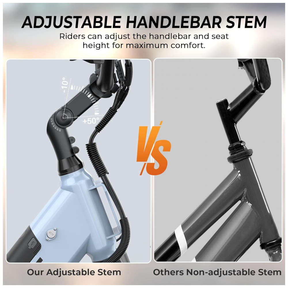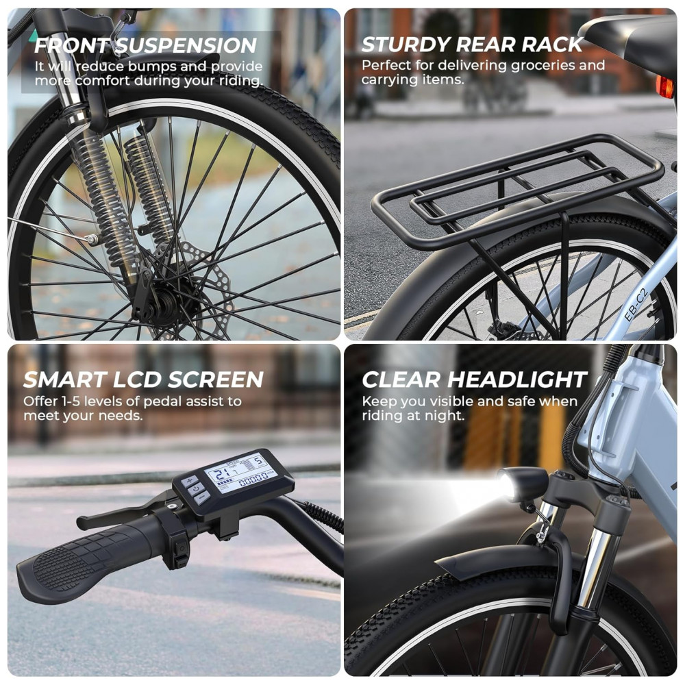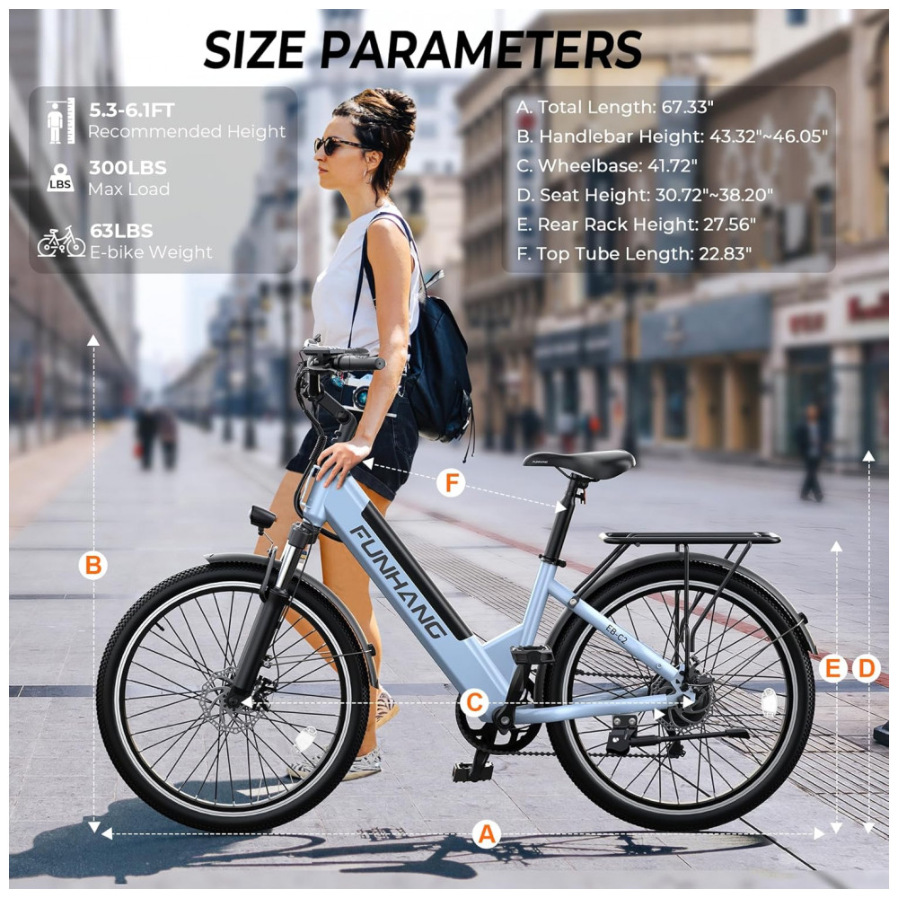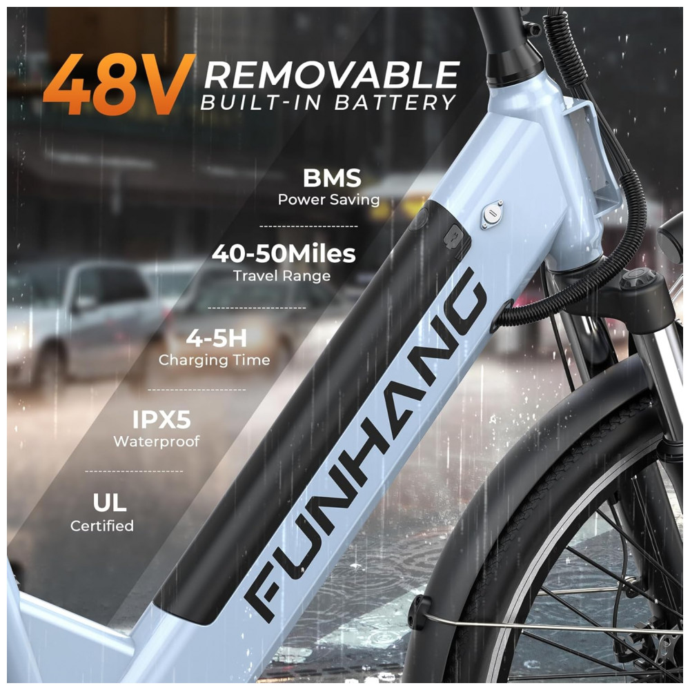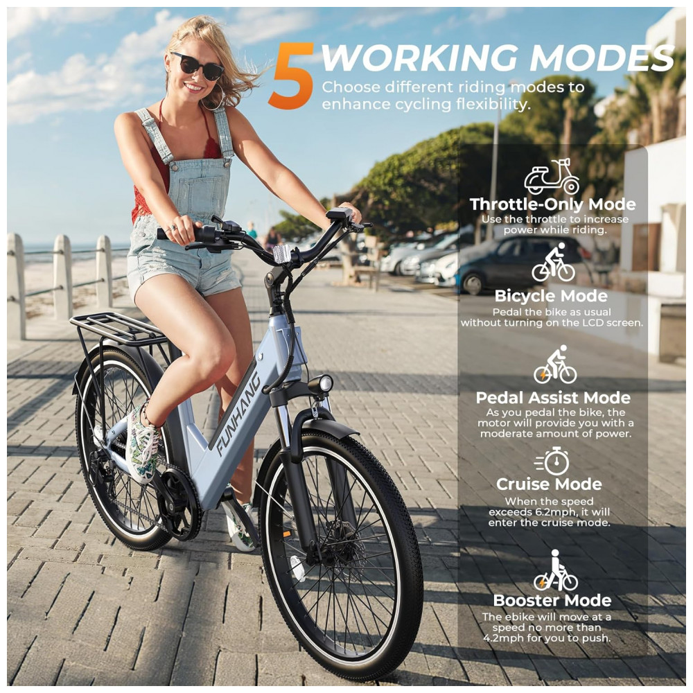 Desfrute de alta potência com o motor sem escovas de 1000W de pico da Bicicleta Elétrica Funhang EBC2, alcançando a impressionante velocidade máxima de 35 km/h. Projetada para o dia a dia, exercícios ao ar livre e aventuras de fim de semana, esta e-bike para adultos permite cruzar facilmente estradas urbanas, terrenos arenosos e trilhas off-road. Com bateria interna removível de 48V, esta bicicleta oferece autonomia de até 80 km em modo de pedal assistido. Ajuste personalizado de altura do guidão e do selim, quadro de passo baixo e capacidade de carga de até 136 kg garantem conforto e segurança. Equipada com suspensão dianteira, freios a disco duplo, farol brilhante, display LCD, bagageiro traseiro e para-lamas, proporcionando uma experiência premium. Aproveite os 5 modos de funcionamento, incluindo Elétrico Puro, Assistência de Pedal, Bicicleta Normal, Cruzeiro e Booster, para uma pedalada flexível e eficiente.