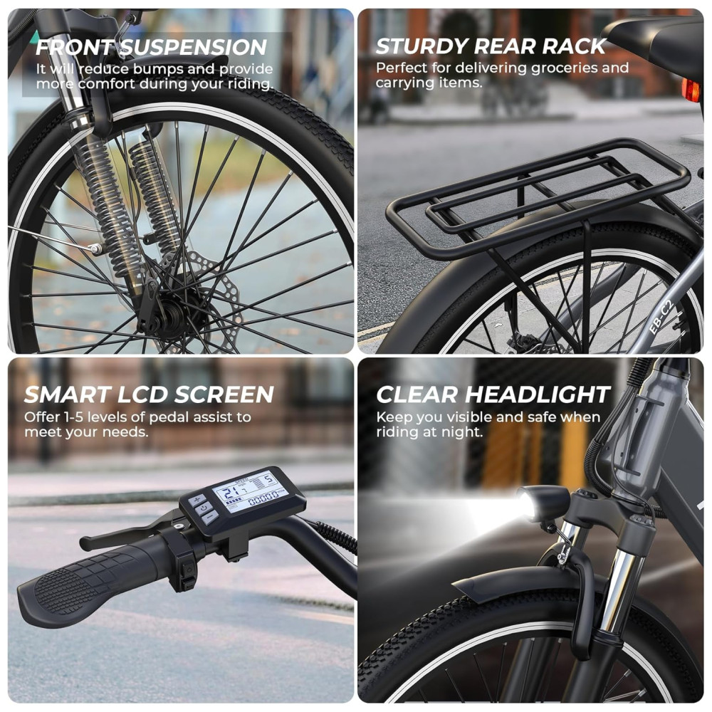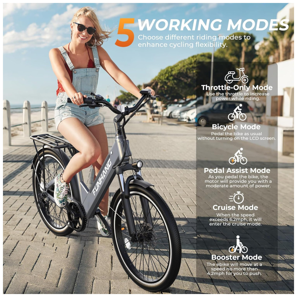A e-bike Funhang EB-C2 oferece motor 500W (pico 1000W), bateria removível de 48V, 5 modos de pilotagem, suspensão dianteira, bagageiro, freios a disco e quadro step-through. Ideal para adultos de até 136 kg.