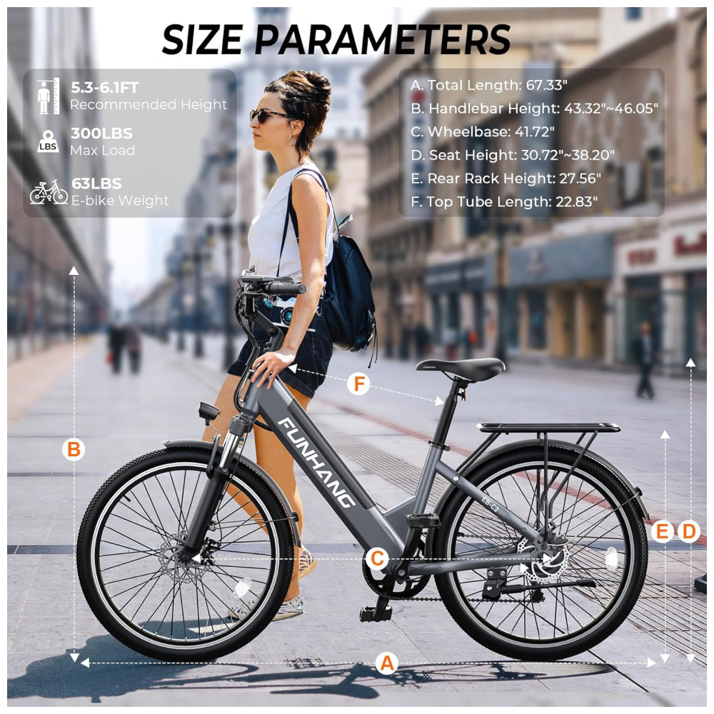 CONFORTO E SEGURANÇA PERSONALIZADOS: O guidão e o selim aprimorados permitem que o ciclista ajuste a altura do guidão e do assento para o máximo conforto. A bicicleta elétrica Funhang com design de quadro passante é ideal para ciclistas adultos, mulheres e homens, de 1,60 a 1,80 m de altura. A carga máxima é de 136 kg. Equipada com garfo de suspensão dianteira para reduzir solavancos, freios a disco duplos para fornecer força de frenagem potente e um farol brilhante que ilumina a estrada à frente para garantir a máxima segurança e conforto.
