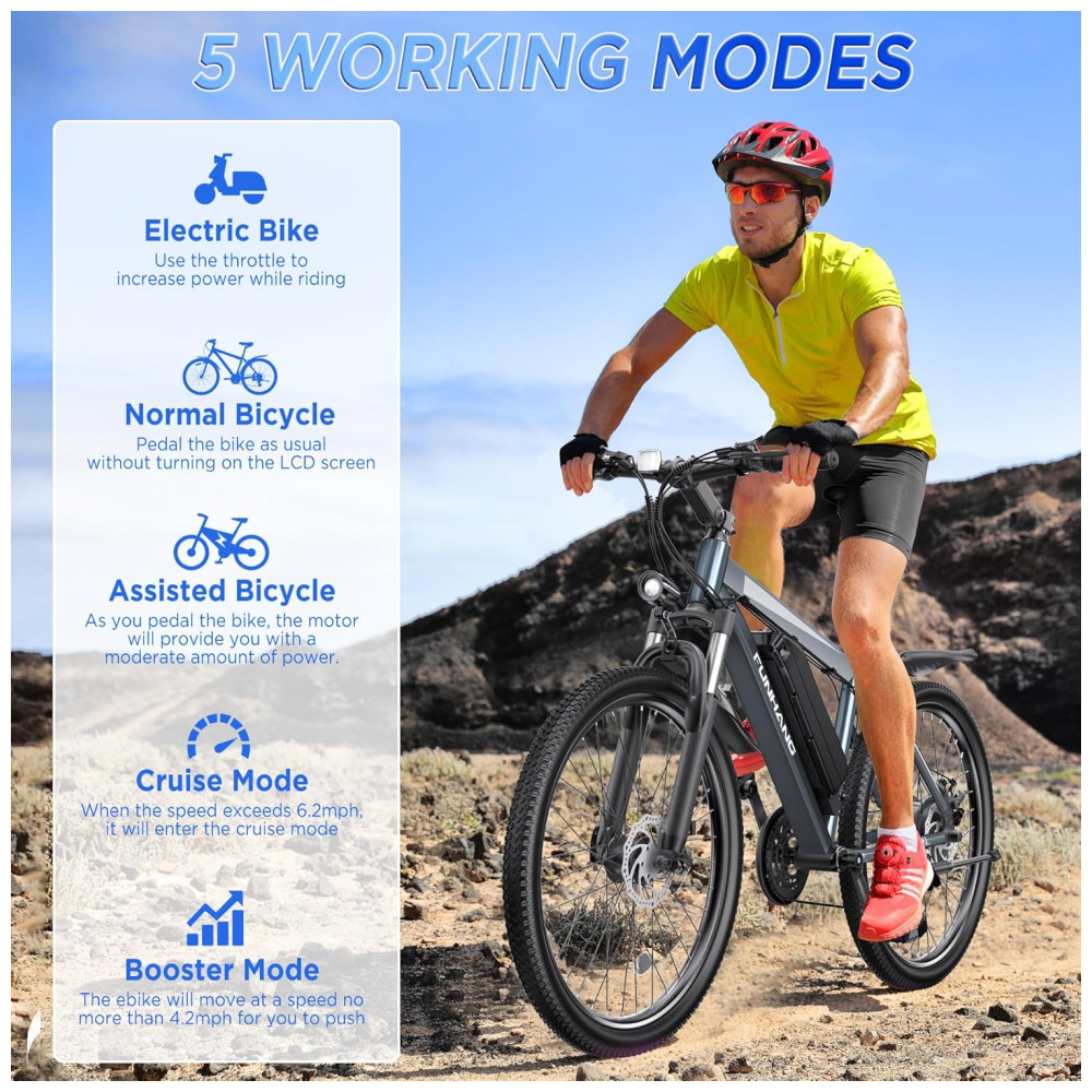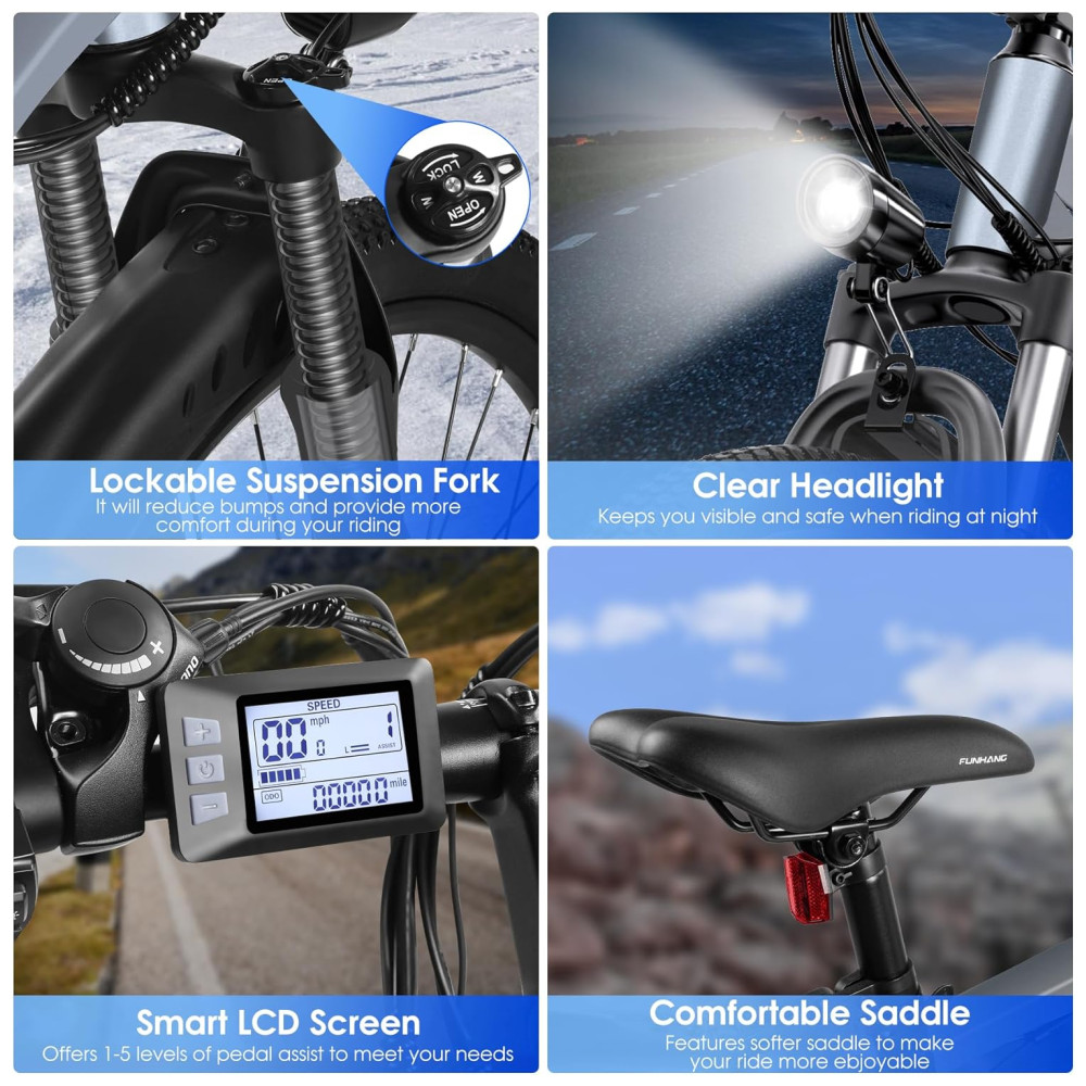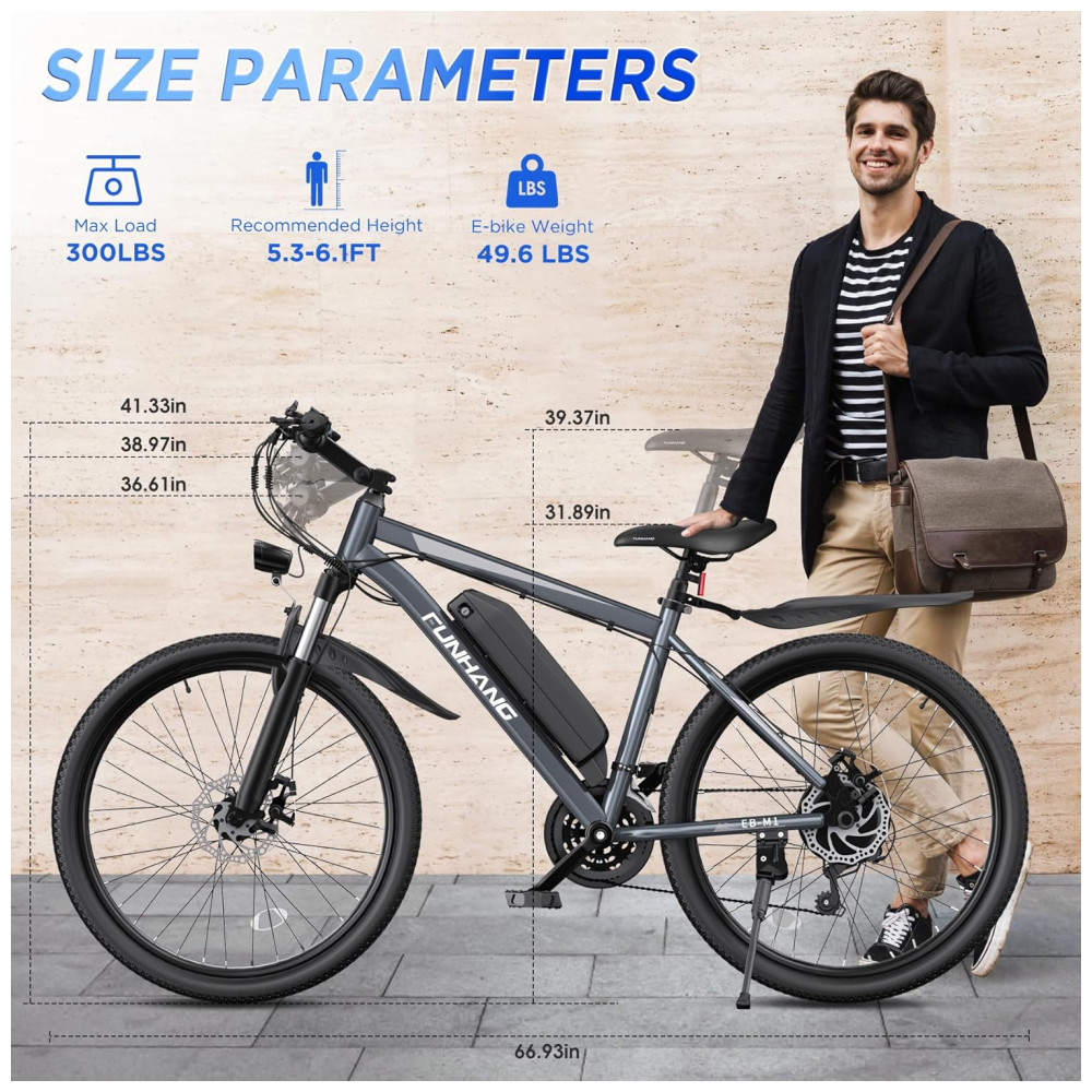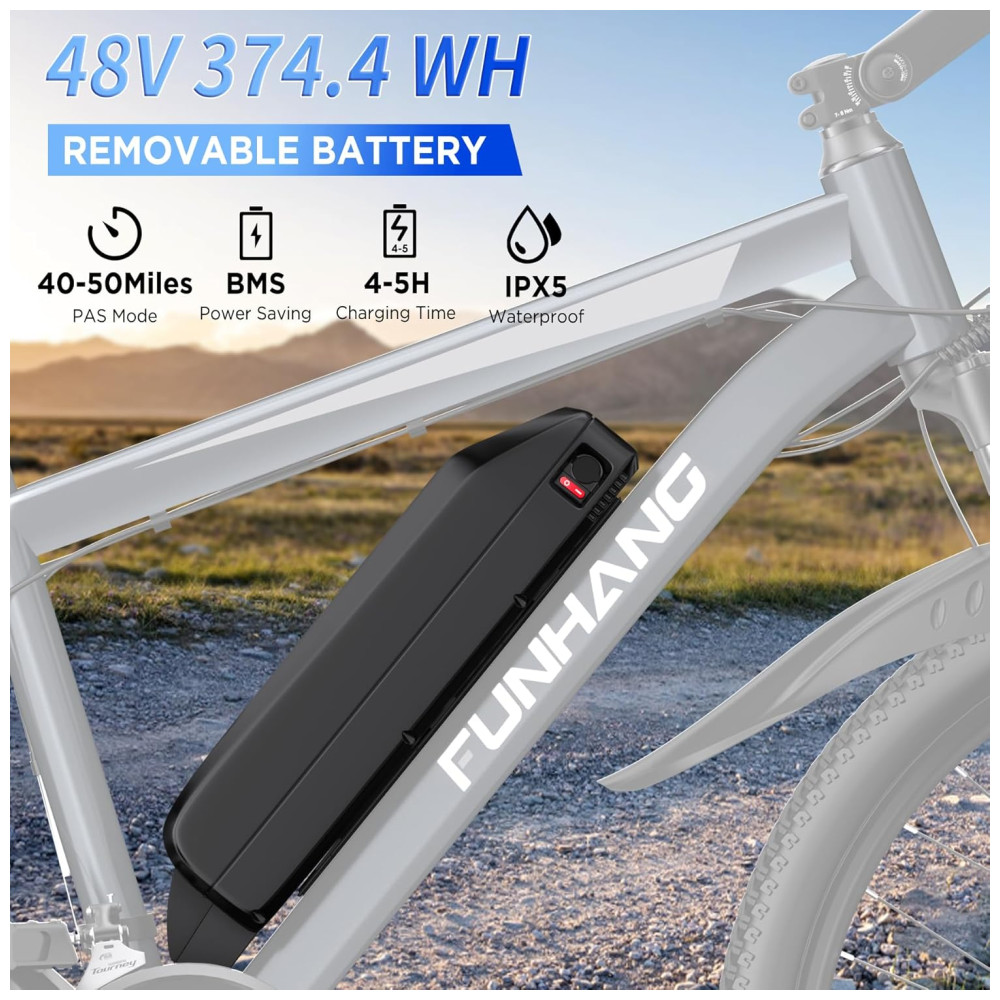 Desfrute de alto desempenho com o motor de 500W (1000W de pico) que permite atingir até 35km/h. Supere facilmente terrenos difíceis, de colinas íngremes a trilhas acidentadas, com potência excepcional para um passeio suave. Com uma bateria removível de alta capacidade de 48V 374.4Wh, alcance até 80 km no modo elétrico puro. A bicicleta elétrica Funhang oferece conforto e confiabilidade, com design ajustável, suspensão dianteira travável, tela LCD clara, 21 velocidades e selim macio. Explore facilmente cinco modos de condução diferentes para atender às suas necessidades. Assembleia fácil e suporte pós-venda profissional garantidos.