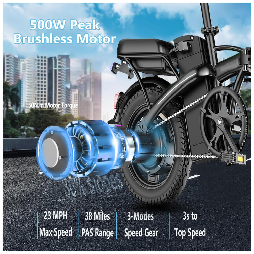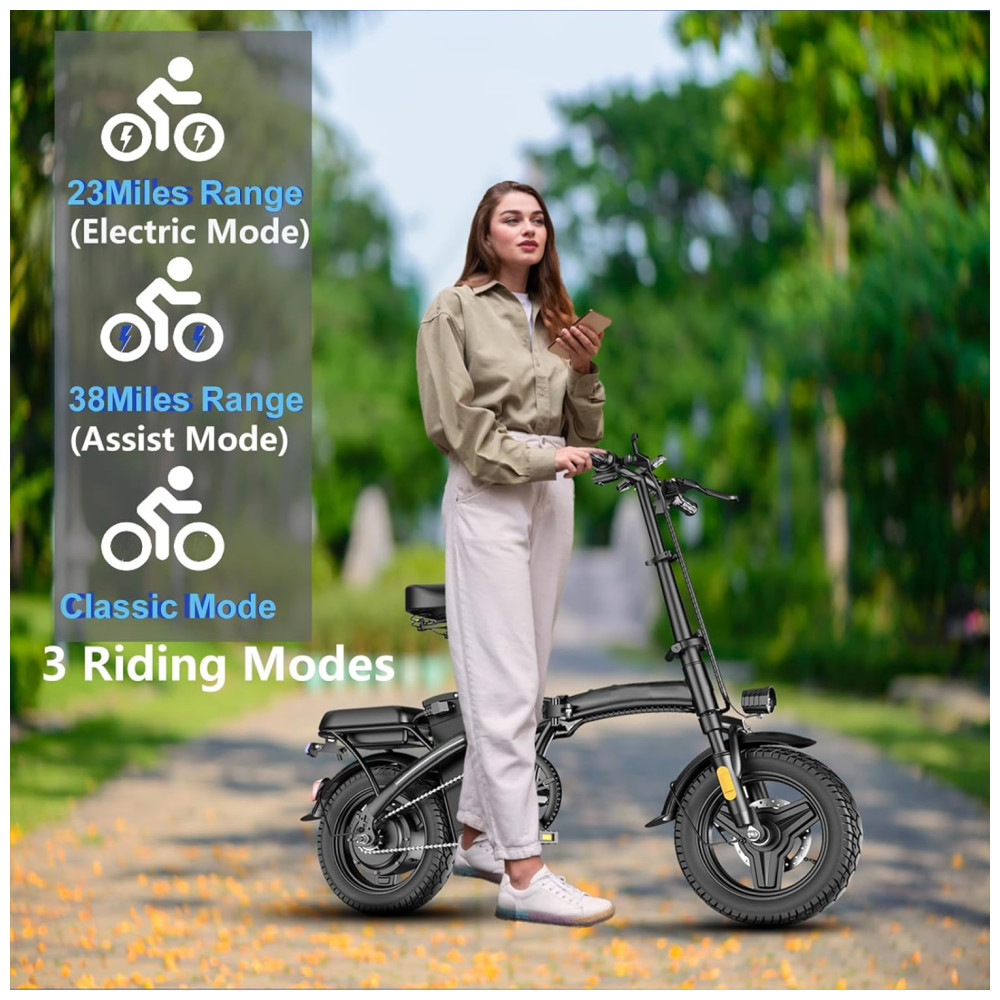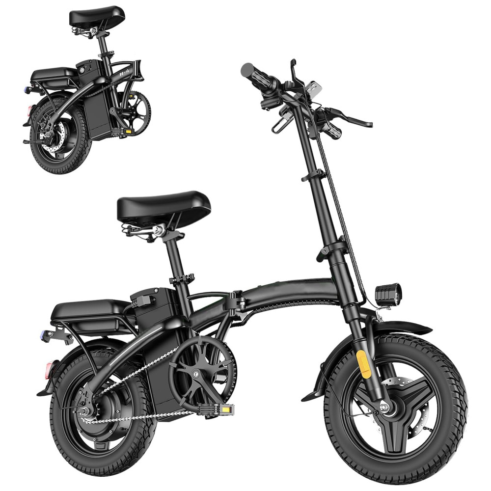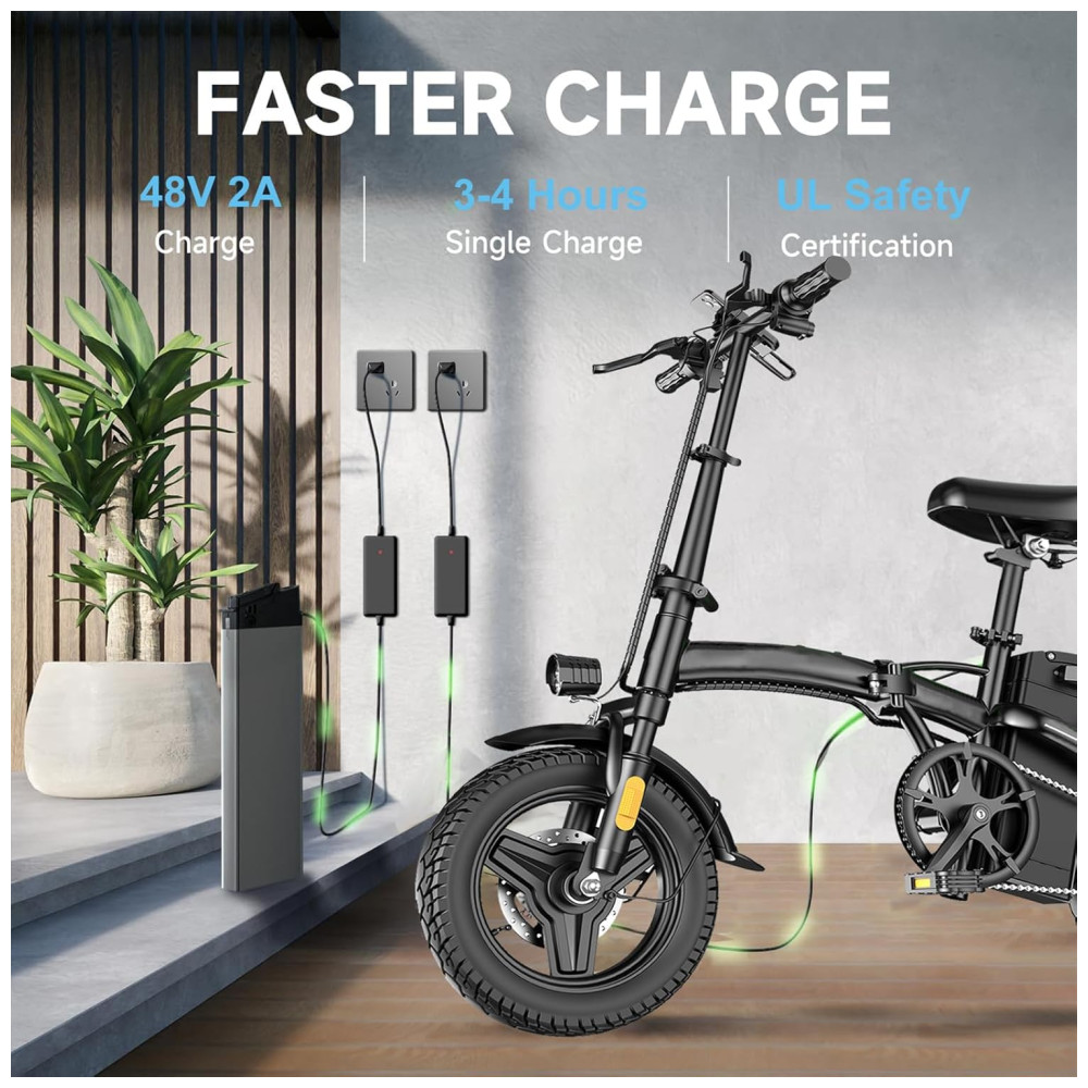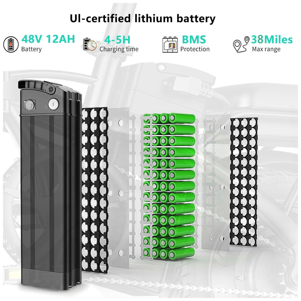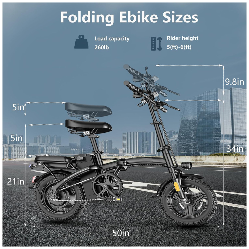Desempenho Robusto com Segurança Certificada pela UL Esta ebike de commuter atende aos rígidos padrões de segurança UL2849 GCC, passando por testes de durabilidade de 322km em estradas urbanas e trilhas moderadas. O invólucro da bateria resistente ao fogo e o quadro de liga reforçada garantem desempenho confiável para aventuras diárias. Motor de Pico de 500W com Capacidade de Subida de 30 Graus O motor sem escovas de 500W (400W contínuos) alcança velocidade máxima de 37km/h e conquista facilmente subidas de até 25 graus, suportado por três modos de operação: Apenas acelerador para arranques rápidos, assistência de pedal para longos trajetos e modo pedal clássico para exercício. Bateria Inteligente de 48V com Proteção BMS Equipada com uma bateria de lítio removível de 48V 12Ah e proteção BMS de 6 camadas, essa ebike alcança uma autonomia de até 61km com PAS (20-25 milhas no modo acelerador). O design à prova d’água IP55 e a capacidade de carga rápida de 4 horas a tornam ideal para deslocamentos chuvosos. Design Compacto de Dobramento em 10 Segundos O quadro leve de 36cm dobra-se para 109.2×53.3×53.3cm em dois passos: destrave a trava e levante a alavanca. Com assento e guidão ajustáveis, capacidade de carga de 260lbs (118kg) e espaço para ciclistas de até 1,70m, ela se encaixa perfeitamente em porta-malas de SUVs, cabines de metrô e cantos de apartamentos. Sistema de Segurança para Todos os Terrenos Ebike com display LCD, farol LED brilhante e luz traseira, equipada com freios a disco dianteiro e traseiro, e alarme antifurto, você pode andar com confiança sabendo que está totalmente protegido para jornadas mais seguras. Acessórios pensados para ebike como farol, buzina e refletor, almofada traseira com assento para passageiro, cesta para transporte e pedais. Confiável e com Garantia Priorizamos qualidade, a bicicleta elétrica dobrável possui 180 dias de garantia, 98 pré-montada, acompanha manual e ferramentas. Para qualquer assistência, entre em contato conosco, responderemos em até 12 horas.