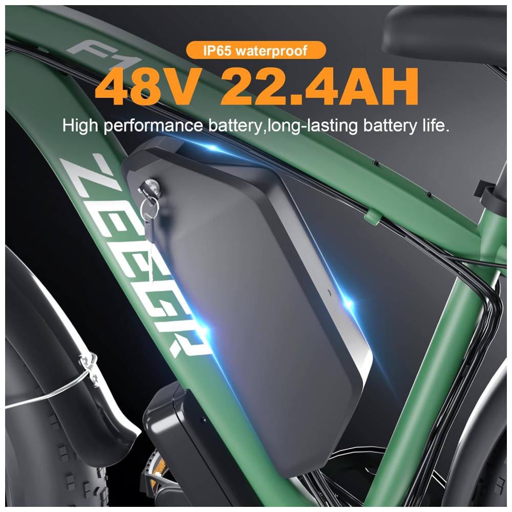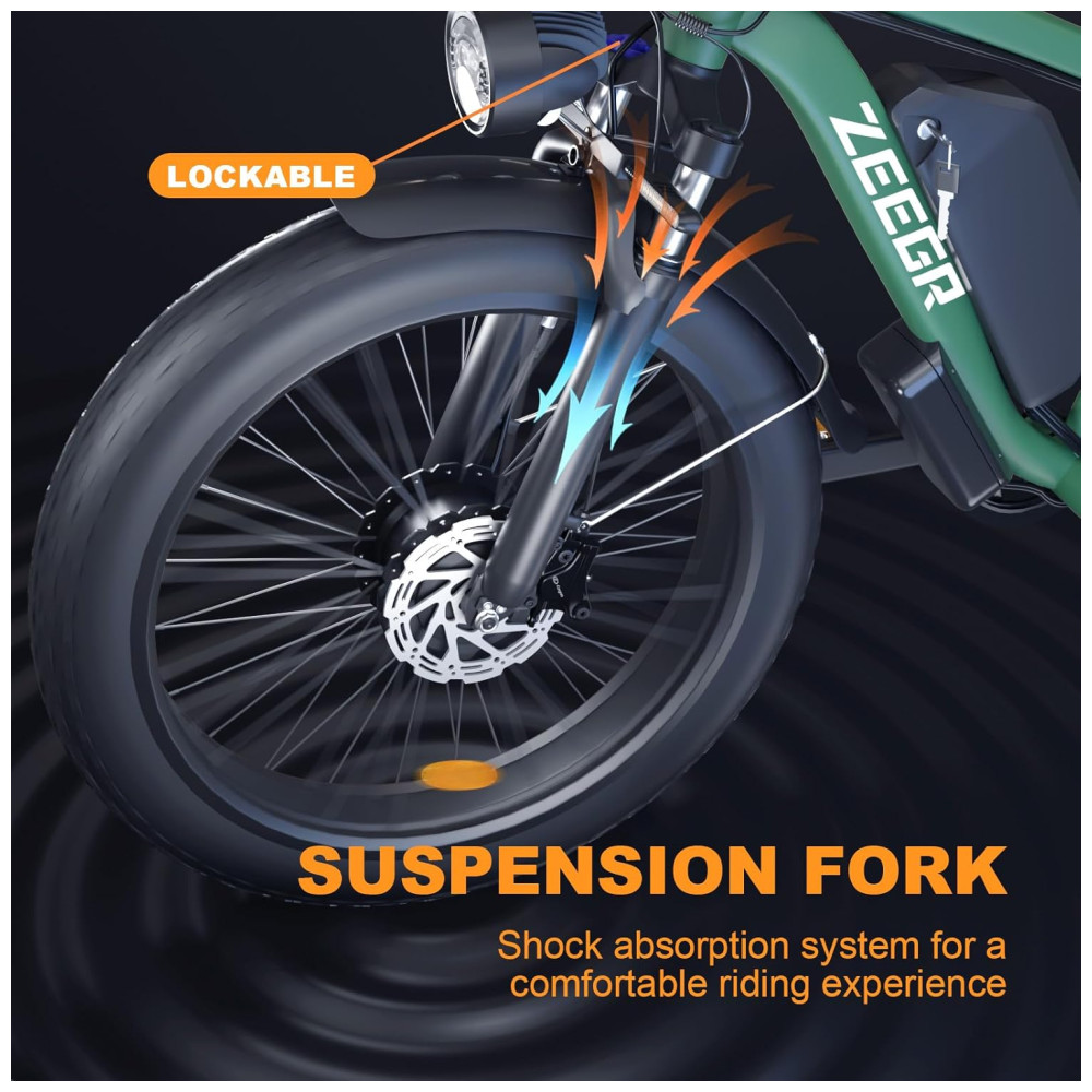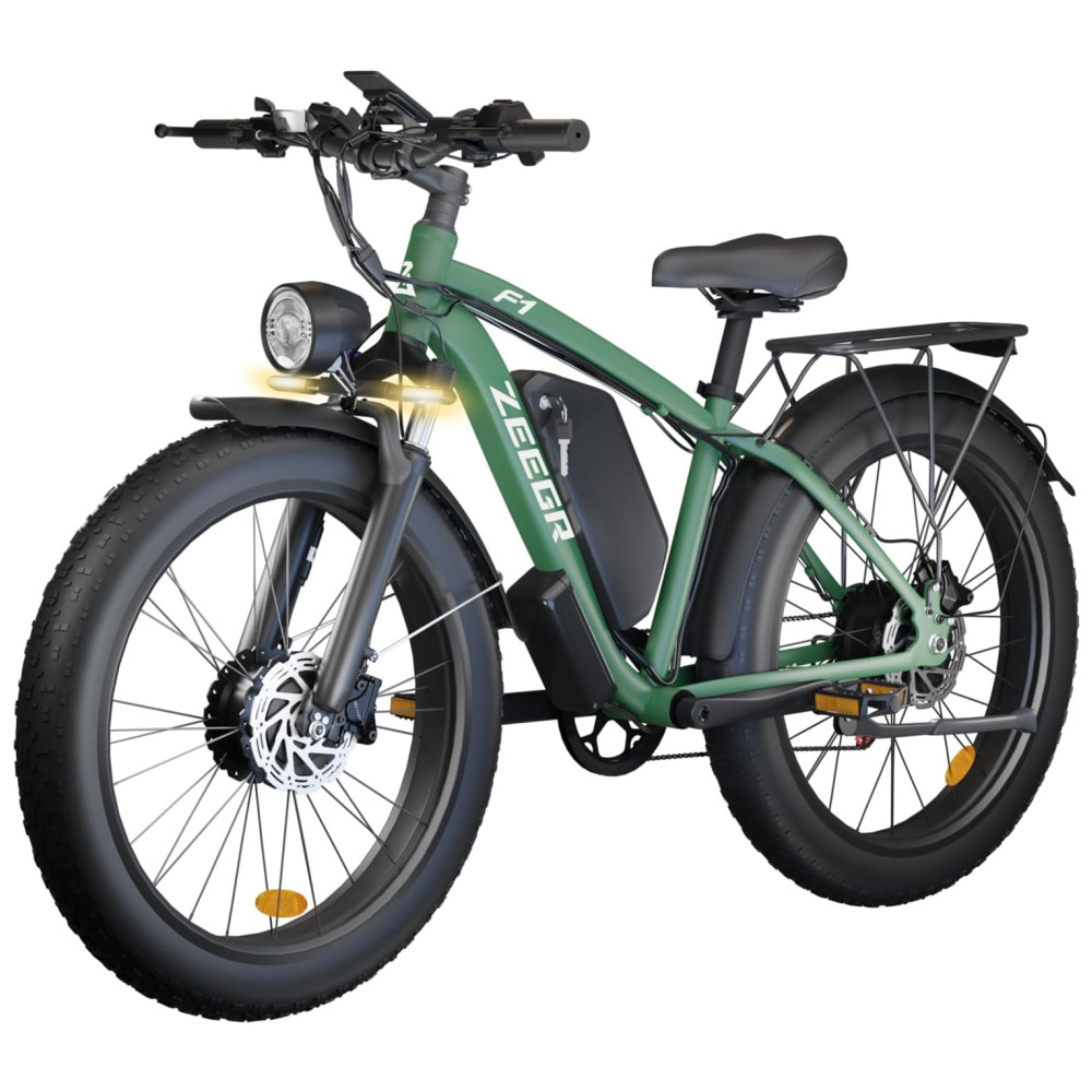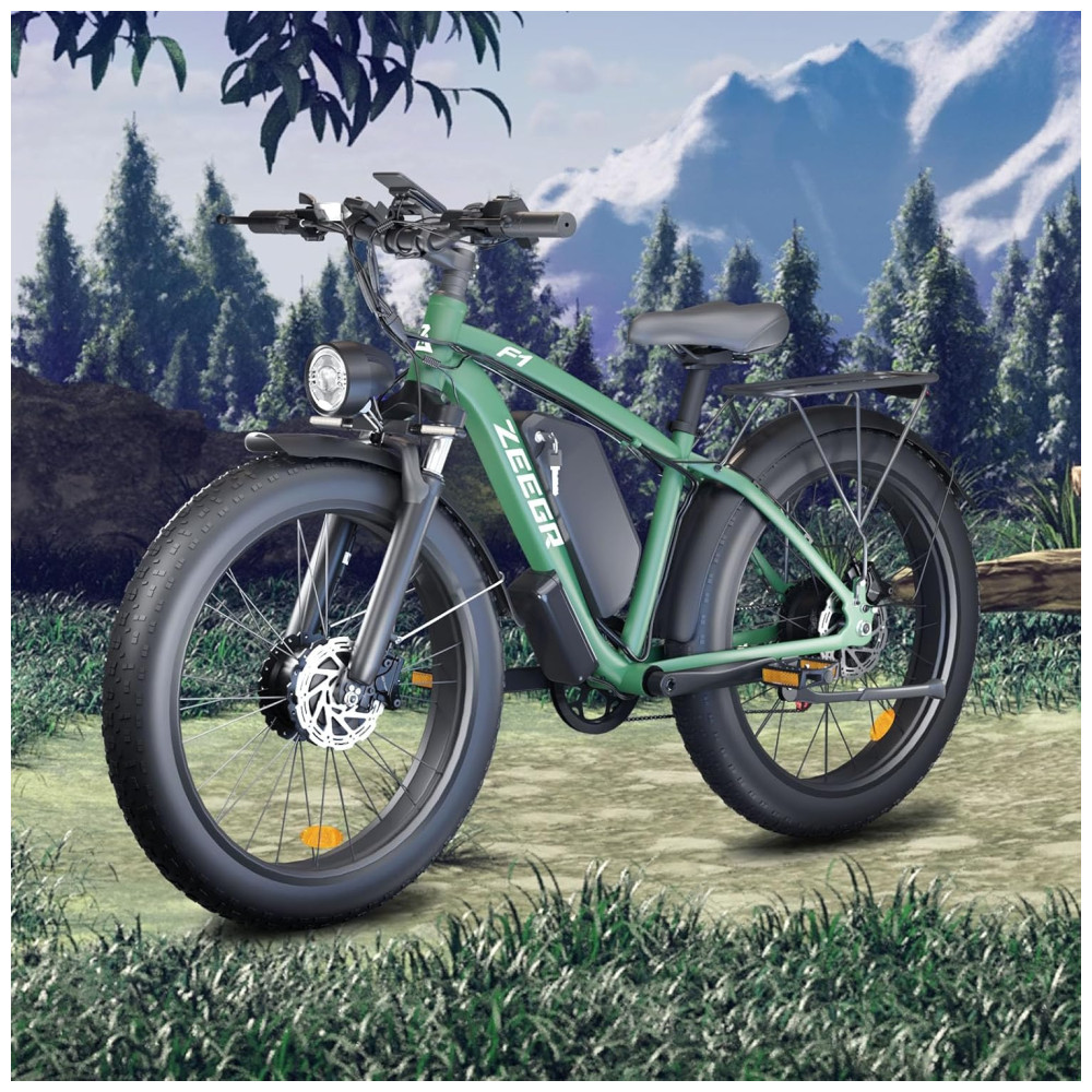 Bicicleta Elétrica ZEEGR 2000W para Adultos Motor Duplo Bateria 48V 224Ah 96 km Autonomia Pneus 26×4.0 Freio Hidráulico Suspensão 7 Marchas 56 km/h Verde