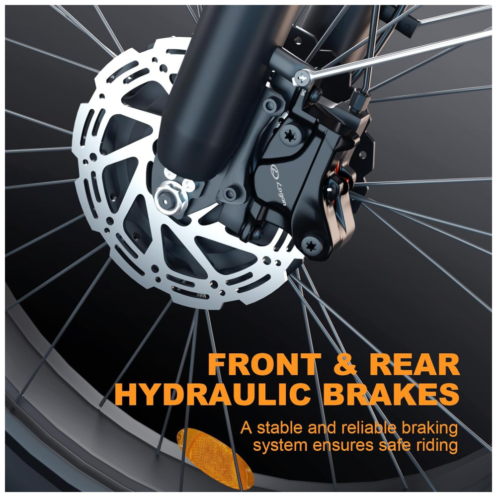 Bicicleta elétrica para adultos: Equipada com freios a disco hidráulicos dianteiros e traseiros, esta motoneta elétrica oferece uma frenagem fácil em 2 segundos, segura e profissional. O garfo de suspensão com trava de alta qualidade tem um bom efeito de absorção de choque, ajudando você a sentir menos fadiga e a desfrutar de uma pilotagem mais suave, independentemente do terreno.