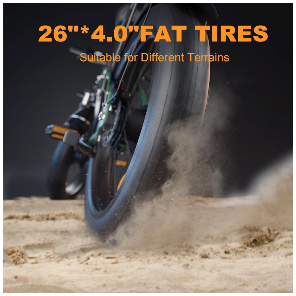 Bicicleta Elétrica com Pneus Fat: O pneu fat de 26” x 4.0” com padrões de piso possui uma área de contato mais ampla, o que aumenta a flexibilidade, excelente aderência, resistência ao desgaste e função antiderrapante para maior segurança em dias chuvosos. 4 modos de funcionamento: modo elétrico puro, modo com pedal assistido (5 níveis), modo conforto e modo bicicleta normal. Esta bicicleta elétrica para adultos pode atender às suas necessidades diárias de deslocamento e atividades ao ar livre.