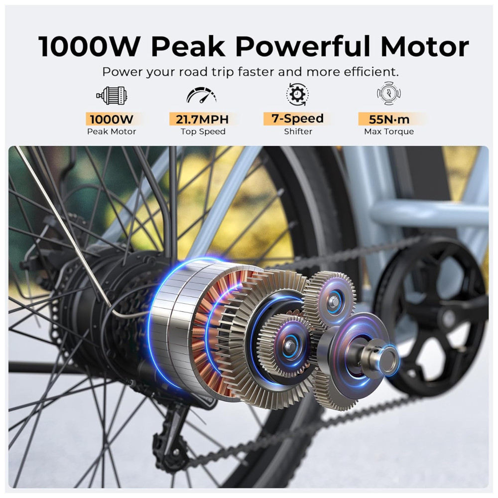 Característica Especial: Motor de Pico de 1000 W, Bateria de Íons de Lítio Removível de 48 V e 374,4 WH, Quadro Step-Thru, Display LCD, 7 Velocidades, 5 Modos de Trabalho e 5 Níveis de PAS, Amortecedor Dianteiro, Freios a Disco Duplos, Bagageiro Traseiro, Para-lamas, Farol de LED, Buzina Elétrica