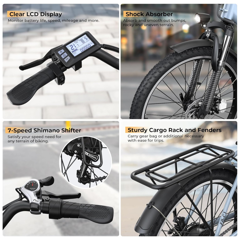 QUADRO DESLIZANTE E GUIDÃO AJUSTÁVEL: As bicicletas elétricas de 26 polegadas são construídas com um quadro de geometria deslizante e assento ajustável que proporcionam conveniência e conforto para todos ao subir e descer da e-bike. O guidão aprimorado pode ser ajustado 30° para cima e para baixo para se adequar às suas posições de pedalada. O bagageiro traseiro robusto permite que você carregue uma bolsa de equipamentos e itens essenciais adicionais durante atividades ao ar livre. Os para-lamas dianteiro e traseiro protegem você dos impactos da água e da lama.