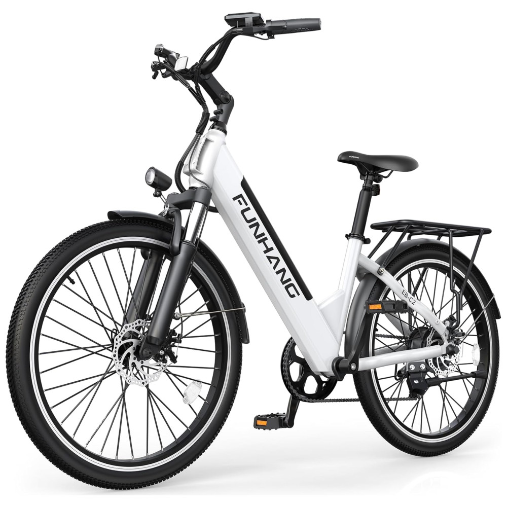 A e-bike Funhang EB-C2 oferece motor 500W (pico 1000W), bateria removível de 48V, 5 modos de pilotagem, suspensão dianteira, bagageiro, freios a disco e quadro step-through. Ideal para adultos de até 136 kg.