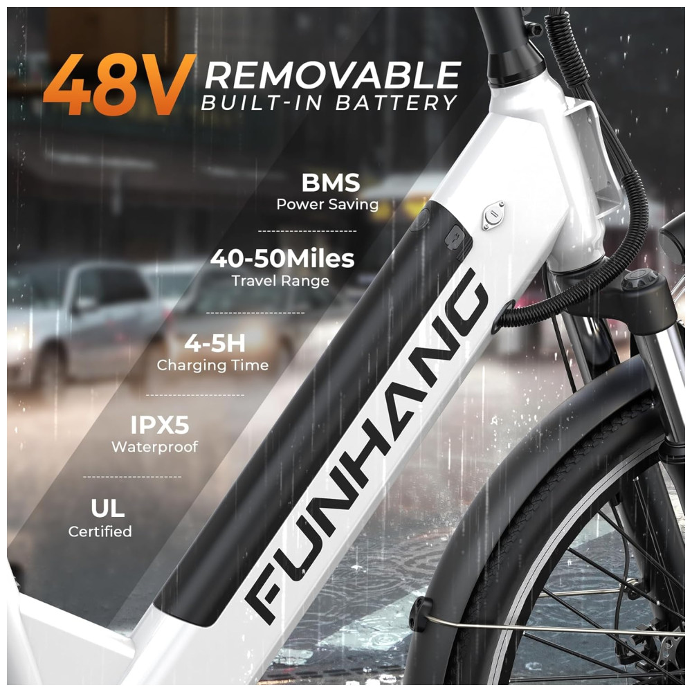 BATERIA INTERNA REMOVÍVEL DE GRANDE CAPACIDADE: As bicicletas elétricas Funhang de 26″ para adultos são alimentadas por uma bateria interna removível de 48 V e 374,4 Wh, com certificação UL, proteção BMS, proteção IPX5 à prova d’água e antirroubo. Os ciclistas podem percorrer uma autonomia de 40 a 48 km no modo acelerador e de 64 a 80 km no modo pedal assistido, dependendo do peso, das condições da estrada e do estilo de pilotagem. O design removível garante máxima conveniência, permitindo que você carregue sem esforço em casa ou no escritório.