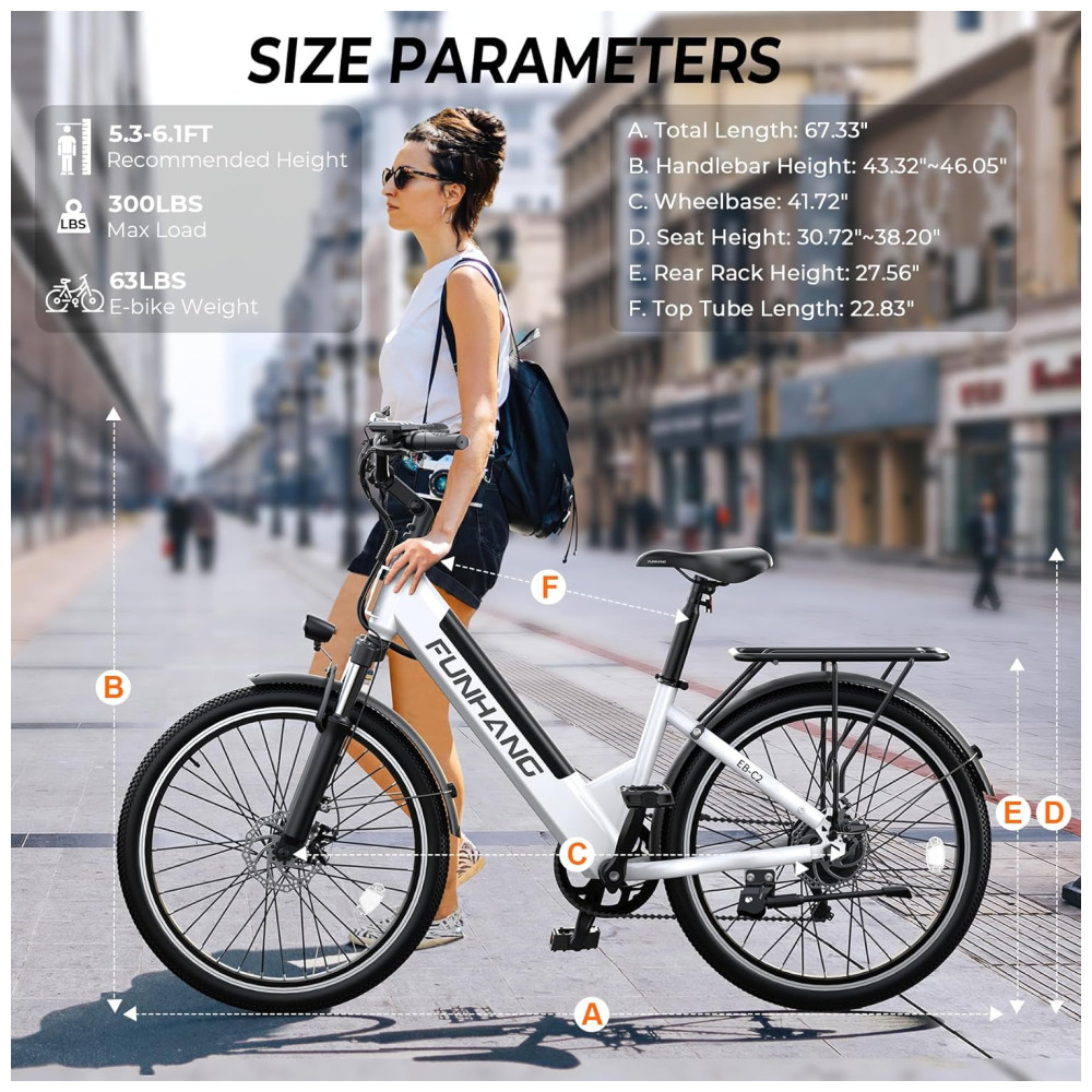 CONFORTO E SEGURANÇA PERSONALIZADOS: O guidão e o selim aprimorados permitem que o ciclista ajuste a altura do guidão e do assento para o máximo conforto. A bicicleta elétrica Funhang com design de quadro passante é ideal para ciclistas adultos, mulheres e homens, de 1,60 a 1,80 m de altura. A carga máxima é de 136 kg. Equipada com garfo de suspensão dianteira para reduzir solavancos, freios a disco duplos para fornecer força de frenagem potente e um farol brilhante que ilumina a estrada à frente para garantir a máxima segurança e conforto.
