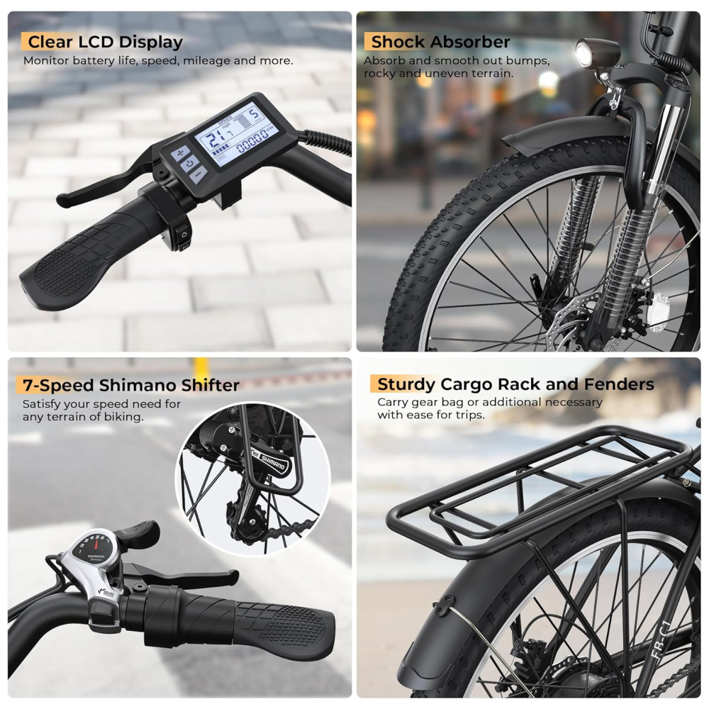 QUADRO DESLIZANTE E GUIDÃO AJUSTÁVEL: As bicicletas elétricas de 26 polegadas são construídas com um quadro de geometria deslizante e assento ajustável que proporcionam conveniência e conforto para todos ao subir e descer da e-bike. O guidão aprimorado pode ser ajustado 30° para cima e para baixo para se adequar às suas posições de pedalada. O bagageiro traseiro robusto permite que você carregue uma bolsa de equipamentos e itens essenciais adicionais durante atividades ao ar livre. Os para-lamas dianteiro e traseiro protegem você dos impactos da água e da lama.