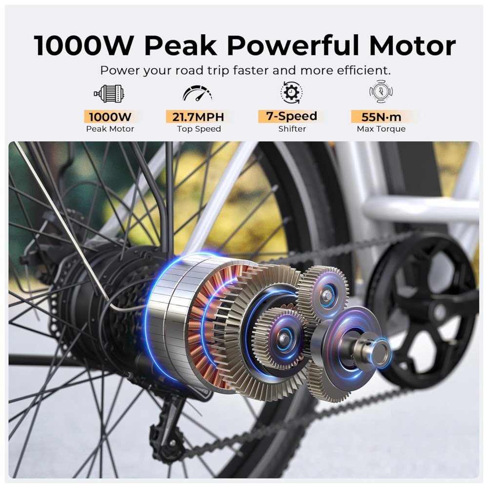 Característica Especial: Motor de Pico de 1000 W, Bateria de Íons de Lítio Removível de 48 V e 374,4 WH, Quadro Step-Thru, Display LCD, 7 Velocidades, 5 Modos de Trabalho e 5 Níveis de PAS, Amortecedor Dianteiro, Freios a Disco Duplos, Bagageiro Traseiro, Para-lamas, Farol de LED, Buzina Elétrica